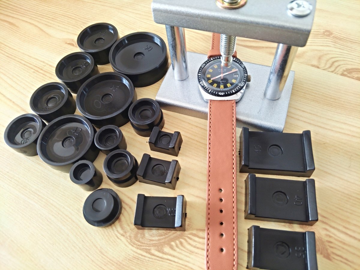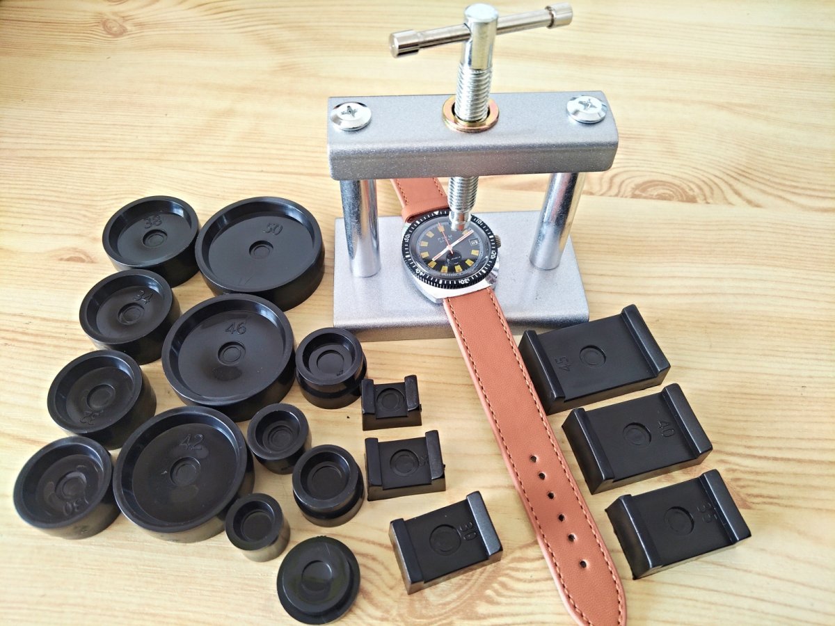 Nový nepoužitý hodinářský kvalitní celokovový lis včetně 18ks nástavců na zapouzdření různých sklíček nebo spodních vík různých typů hodinek. Díky šroubovému převodu zajišťuje jemný a plynulý tlak na sklo nebo víko. Kulaté nástavce jsou plastové a jsou oboustranné (z každé strany jiný rozměr). Součástí lisu je 18x redukční nástavec.
