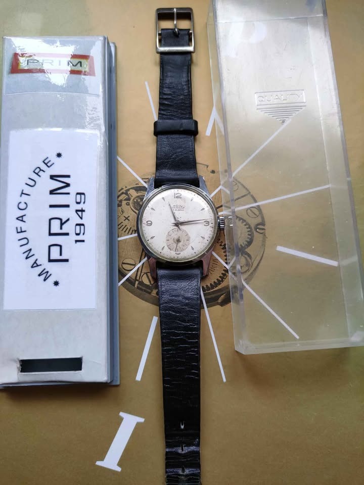 Prodám starší náramkové hodinky Prim - typ 50 013 1. Chromované pouzdro - 32 mm., strojek cal. 50 s manuálním nátahem. Hodinky jsou po servisu u hodináře, vyčištěné a seřízené, skoro v původním stavu. Nová korunka. Dobový řemínek Saturn a krabička v ceně. Možnost koupě bez krabičky a řemínku cena 1500 Kč. Jemná prasklinka skla v oblasti indexu 3. Jako starší, použité zboží bohužel bez záruky. Vážný zájem: video přes Messenger nebo WhatsApp. Cena 2 100 Kč převodem na účet + 100 Kč poštovné: pošta nebo "zásilkovna". Nejbližší okolí po domluvě jsem schopen dovézt osobně. Do zahraničí a na dobírku neposílám. Pouze na Slovensko, po předchozí domluvě.