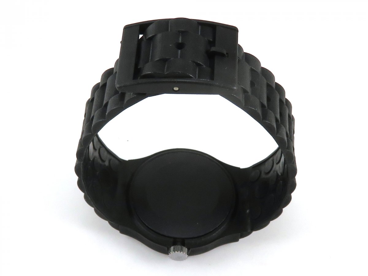 Plastové pouzdro s integrálním náramkem má rozměr 34 x 34 mm.