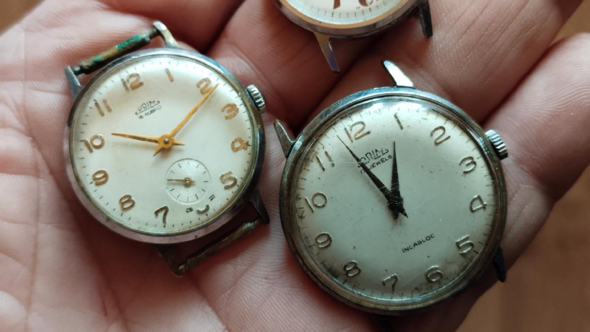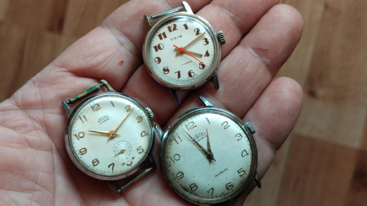 Hodinky Prim funkční jedny se zastavují nečištěno ,Stav viz foto.Hodinky jsou vyřazené z mé osobní sbírky,zboží je použito a tudíž bez záruky.Kupujete to co je na fotu.Snažil jsem se to nafotit v realnem stavu-viz foto.Odesílém řádně zabaleno a pojištěné.Poštuvné dle ceníku ČP.ZÁSILKOVNA.
