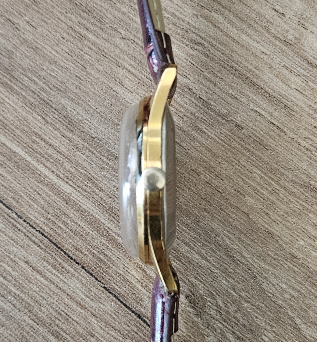 Pouzdro hodinek je zlaté barvy (zlacené) s typickými protáhlými nožkami.