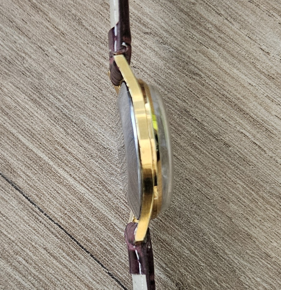 Pouzdro hodinek je zlaté barvy (zlacené) s typickými protáhlými nožkami.