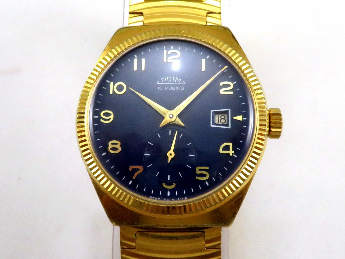 Skládačka - raritní hodinky PRIM přibližně ze 70. let s dobovým zlaceným náramkem.