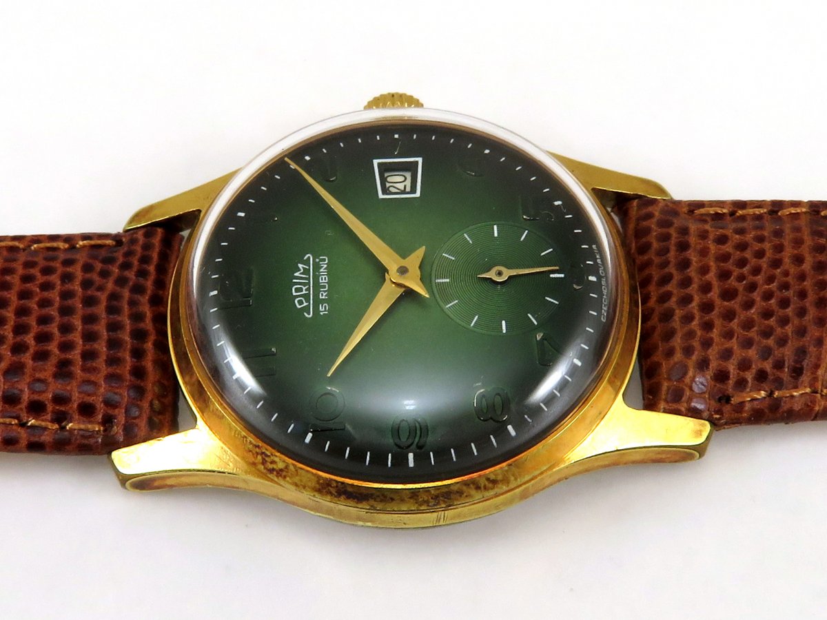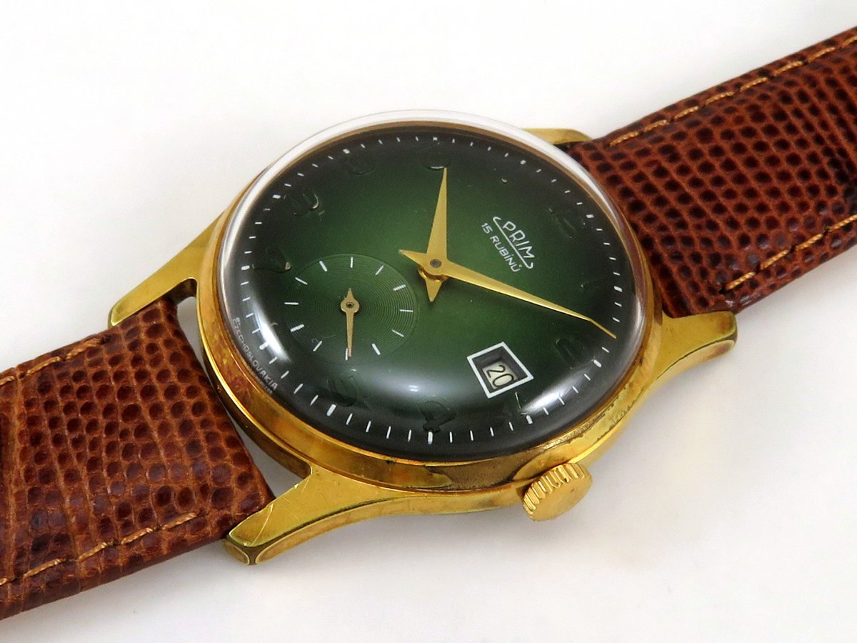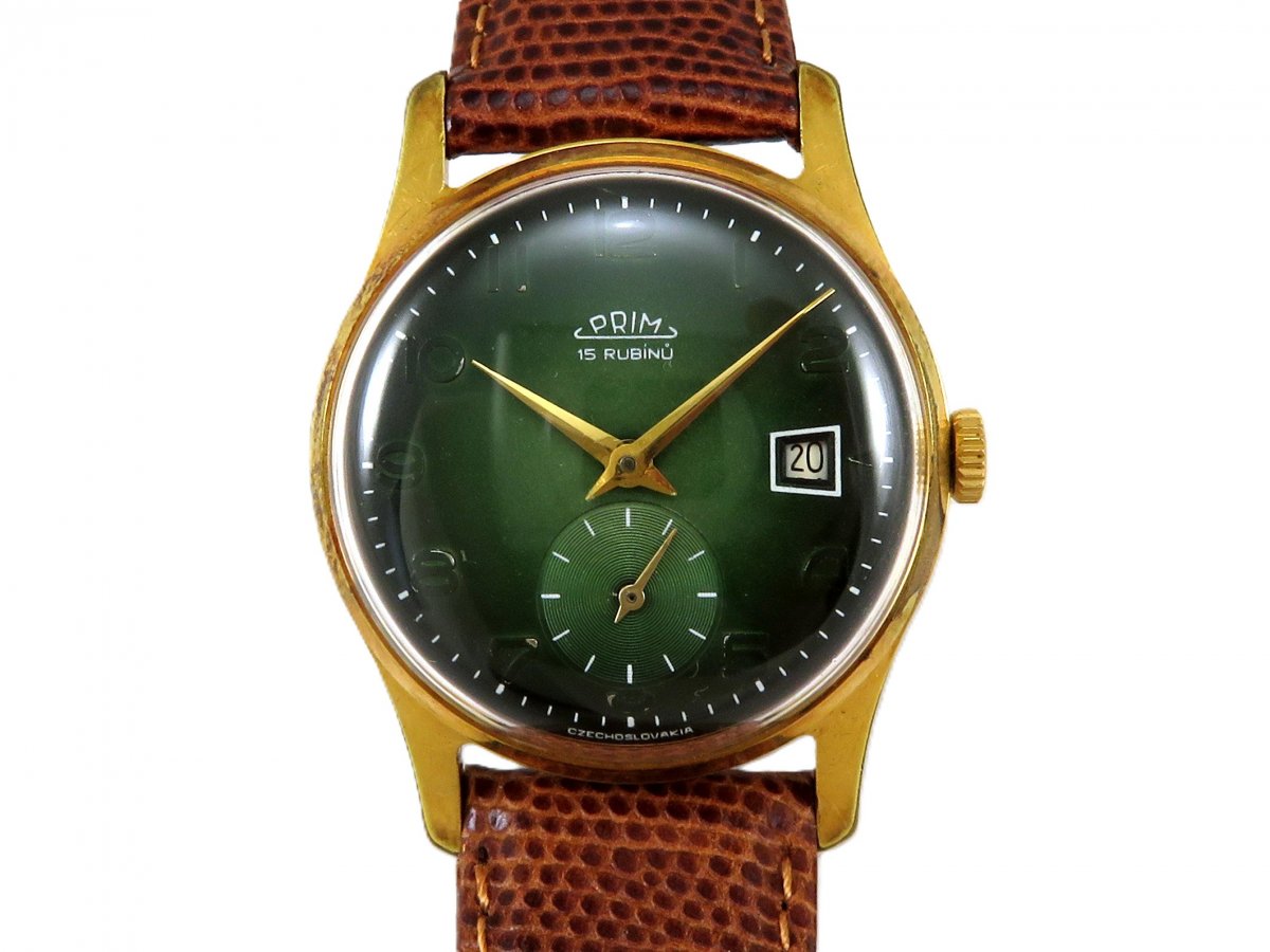 Hodinky PRIM z poloviny 60. let. Do modelu 52 111 3 je vložený barevně upravený číselník.