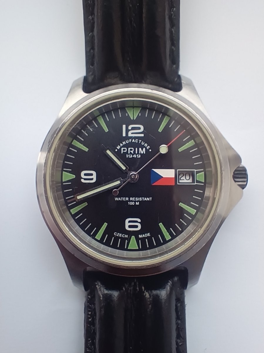 Plně funkční hodinky Prim Manufacture s automatickým strojkem ETA 2824-2. Česká vlajka na ciferníku, korunka vykrytá hyceramem v barvách České vlajky. Řemínek z hovězí kůže.
