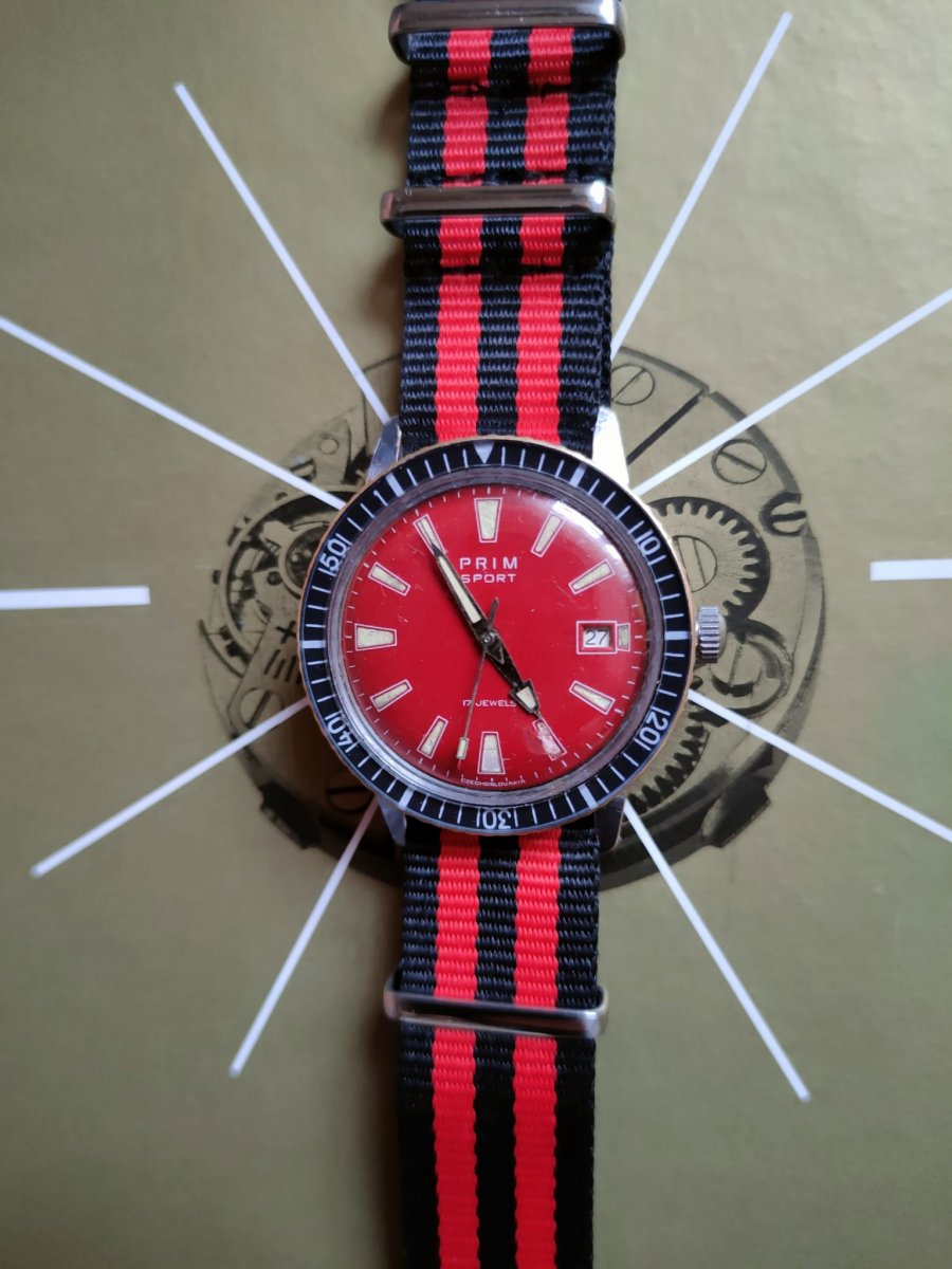 Prodám starší pěkně zachovalé náramkové hodinky Prim -SPORT 1. Chromované pouzdro - 37 mm., strojek cal. 68 s manuálním nátahem a s označením 68.3. Model 68 197 1. Hodinky jsou po servisu, vyčištěné, seřízené a plně funkční. Nová korunka. Nový řemínek NATO v ceně. Jako starší, použité zboží bohužel bez záruky. Vážný zájem: video přes Messenger nebo WhatsApp. Cena 8 500 Kč převodem na účet + 100 Kč poštovné: pošta nebo "zásilkovna". Nejbližší okolí po domluvě jsem schopen dovézt osobně za poplatek. Do zahraničí a na dobírku neposílám. Pouze na Slovensko, po předchozí domluvě.