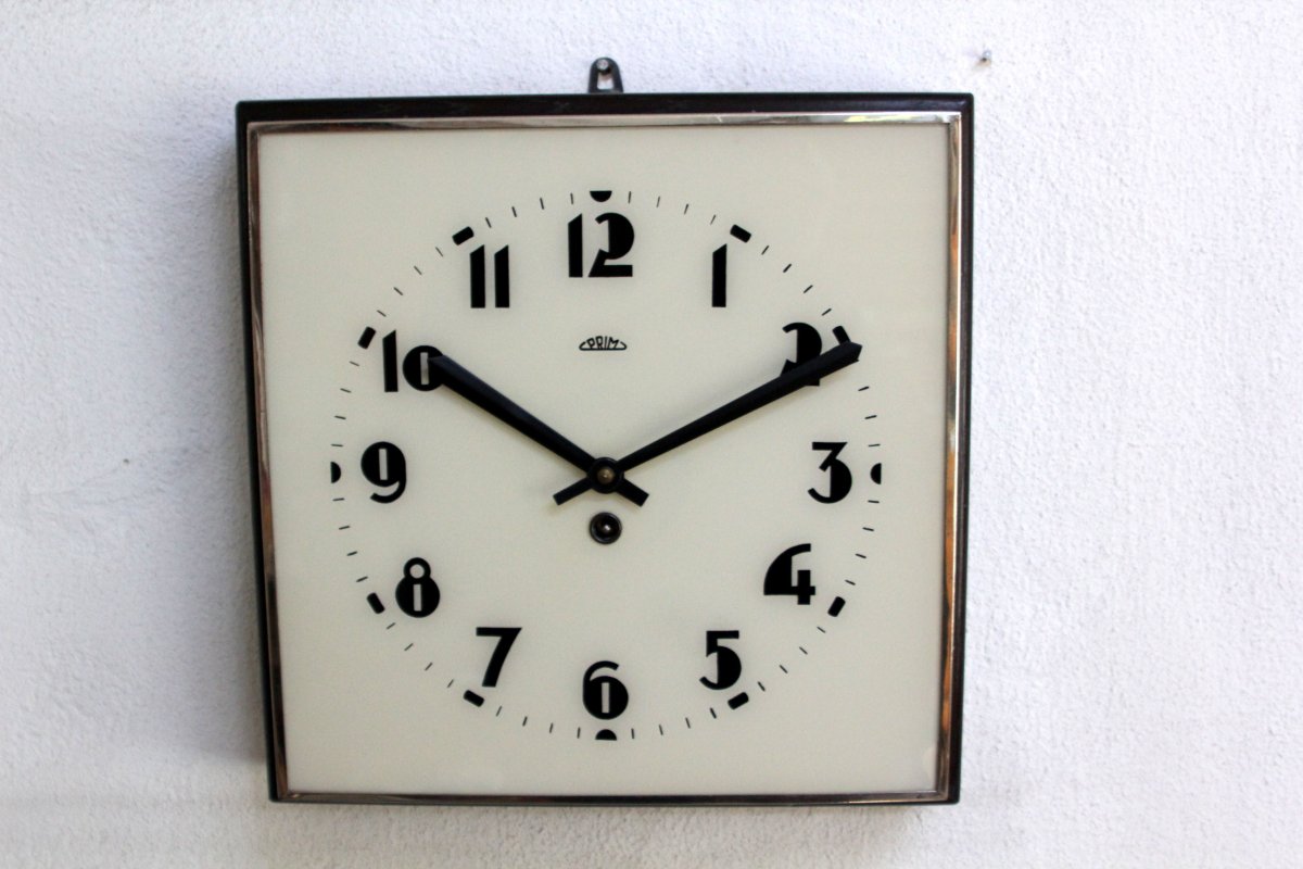 hodiny Prim velké, jako nové, funkční, rozměry 32x32x7cm, součástí je klíček na natahování, z roku 1958,