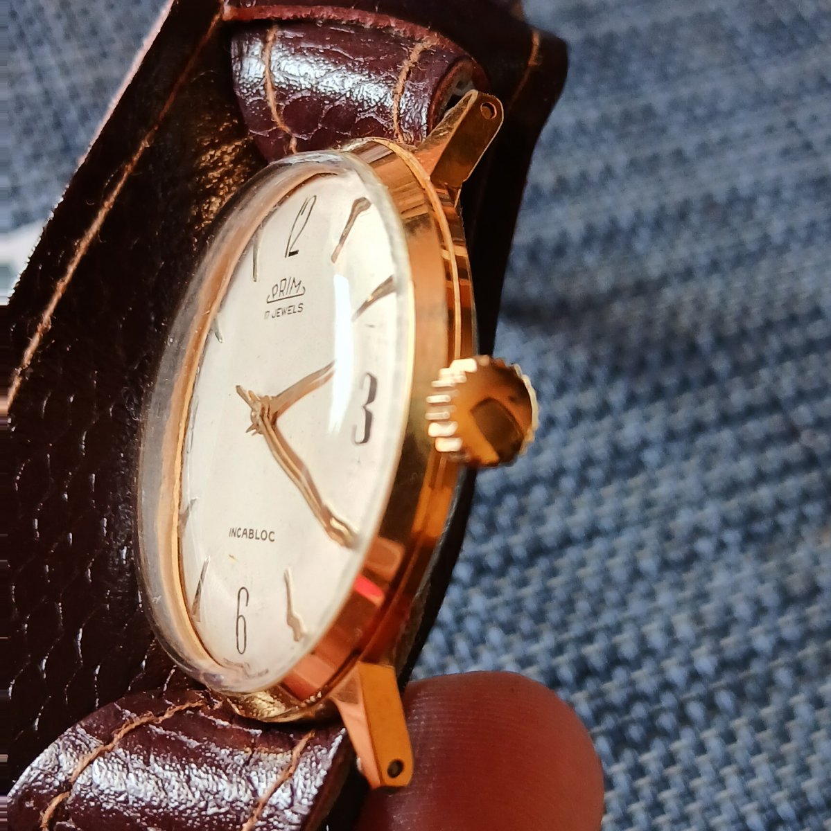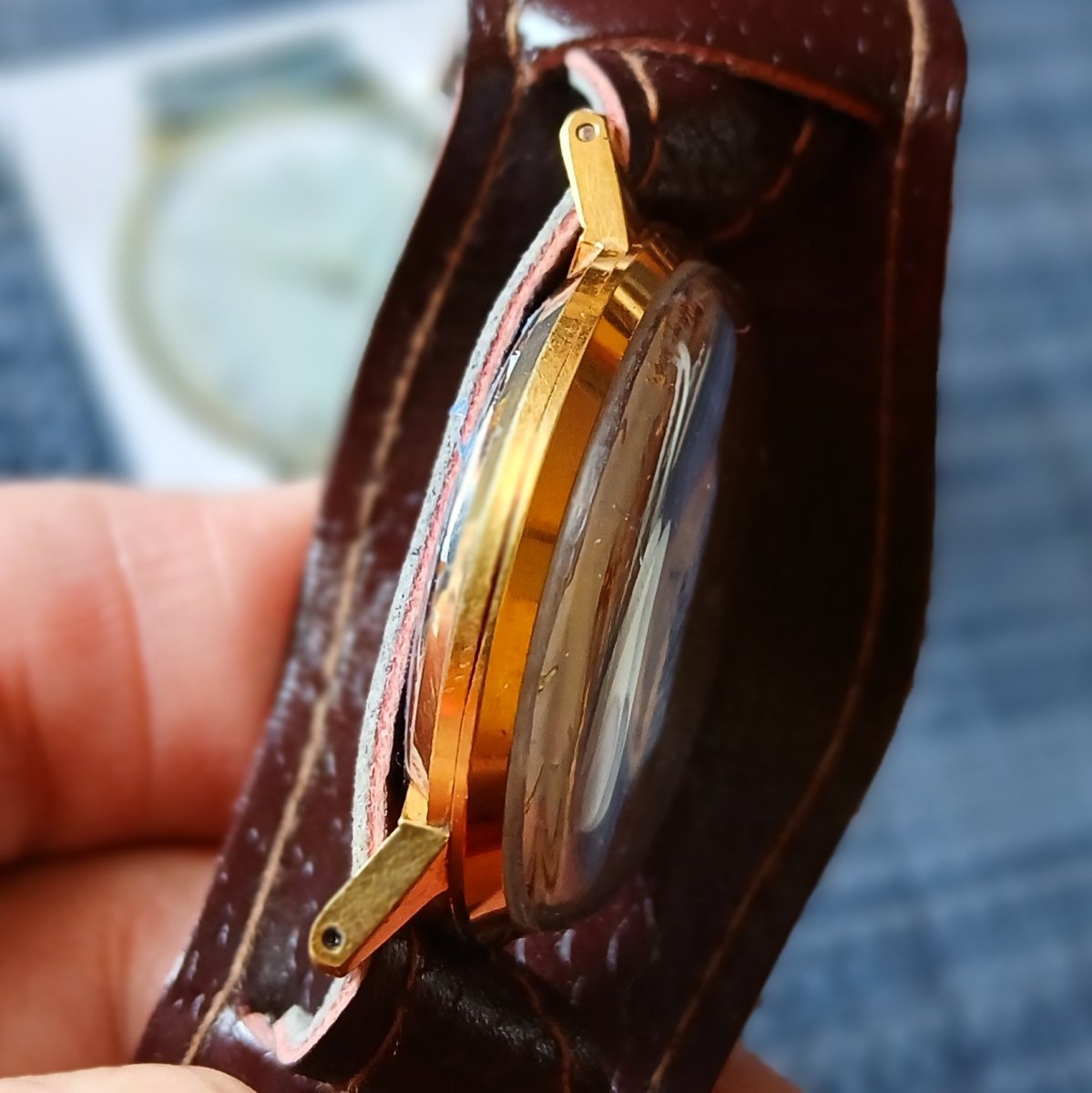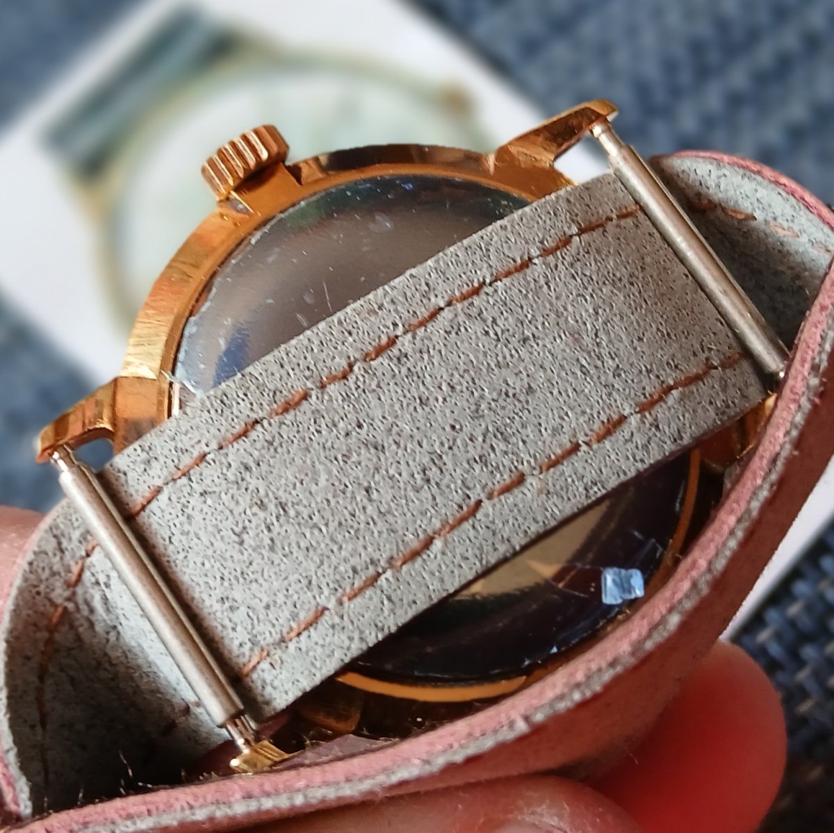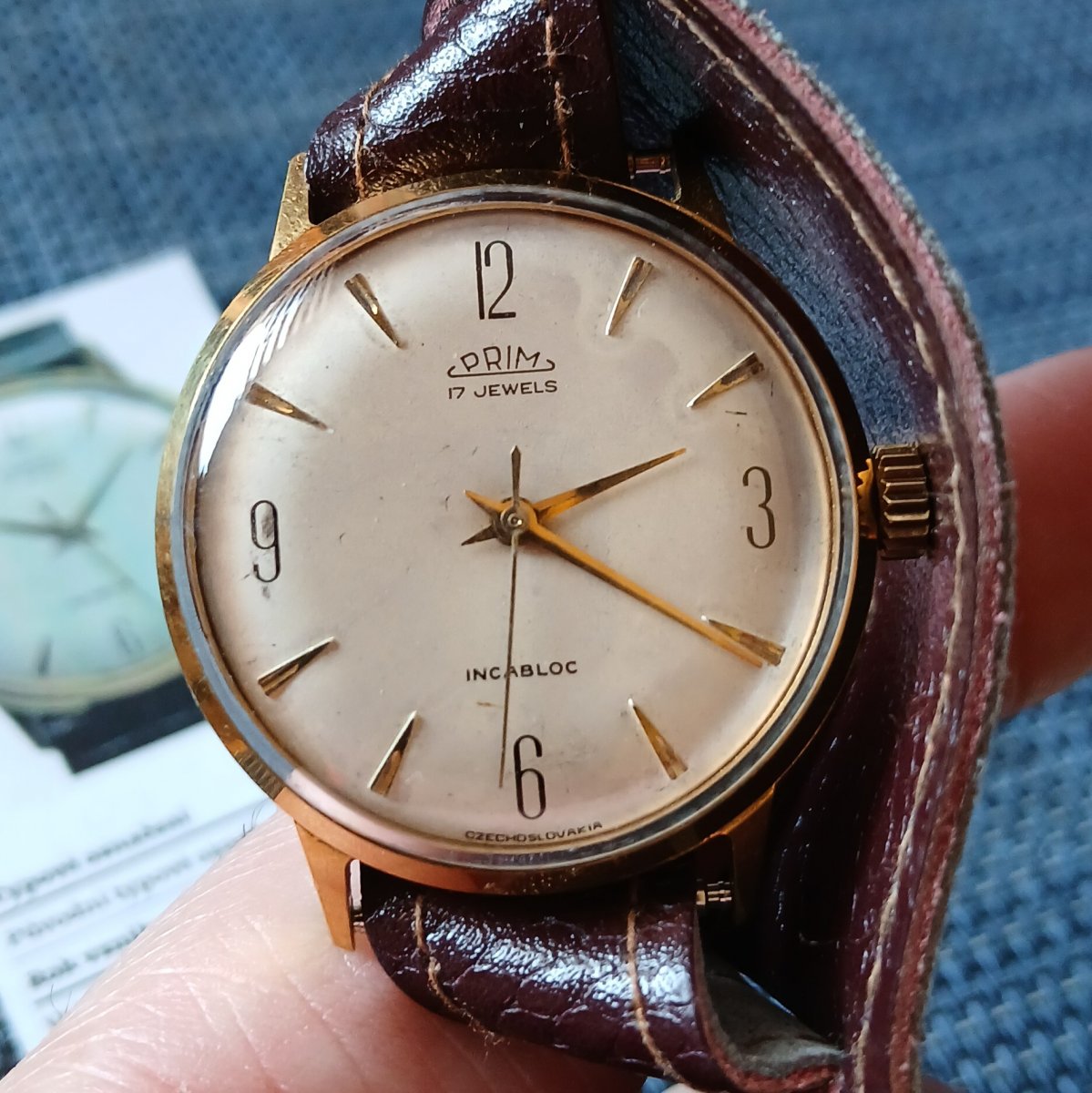 Hodinky funkční po servise. Číselník méně častý šípovytý index. Hodinky včetně dobového pásku.