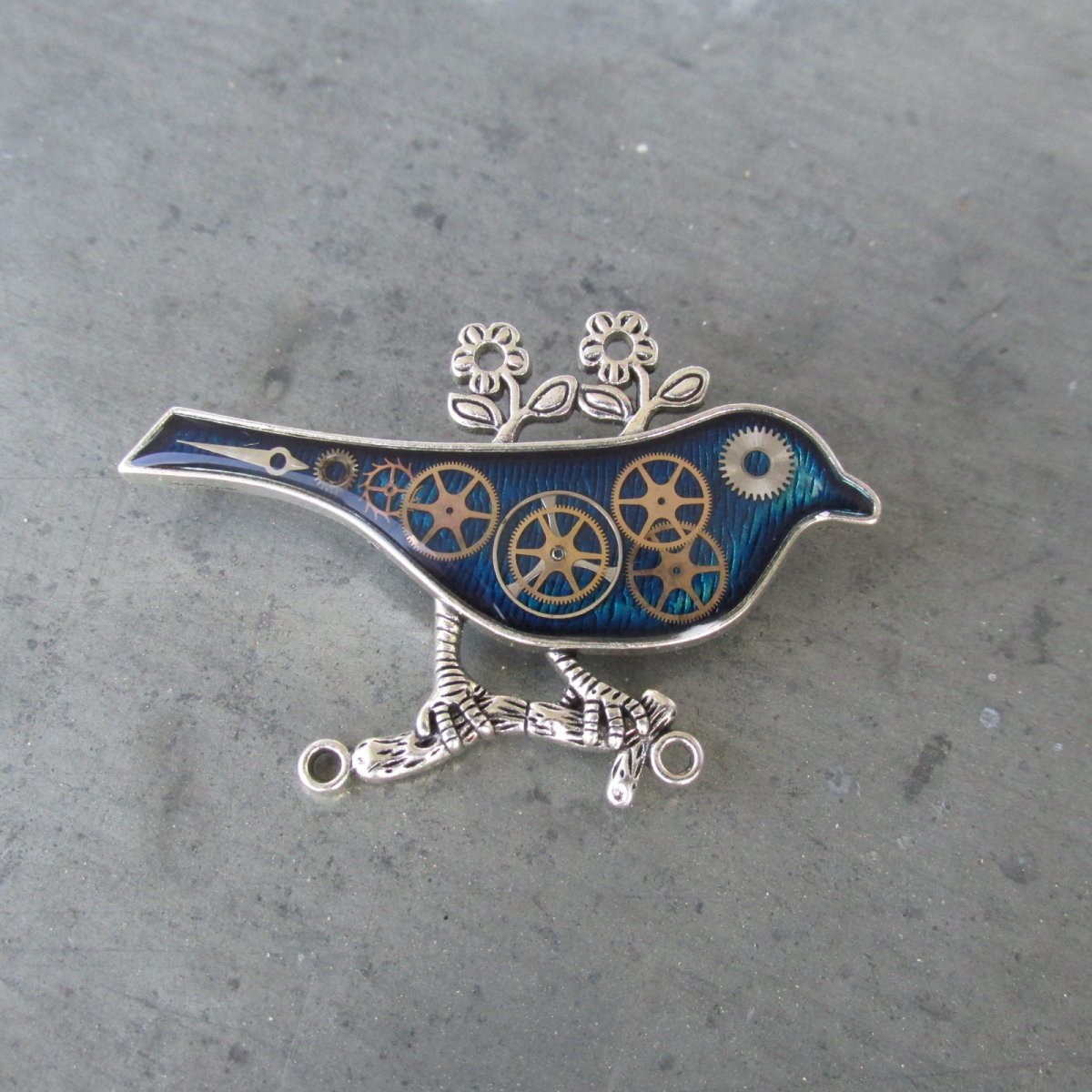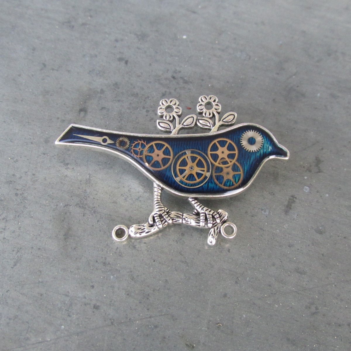 Originální elegantní brož.V OZDOBNÉM STŘÍBRNÉM PTÁČKU BAREVNĚ PODBARVENÉM JSOU ZALITY V LESKLÉ KŘIŠŤÁLOVÉ PRYSKYŘICI SOUČÁSTKY Z HODINEK PRIM, CELKOVÁ VELIKOST JE 4x6cm.