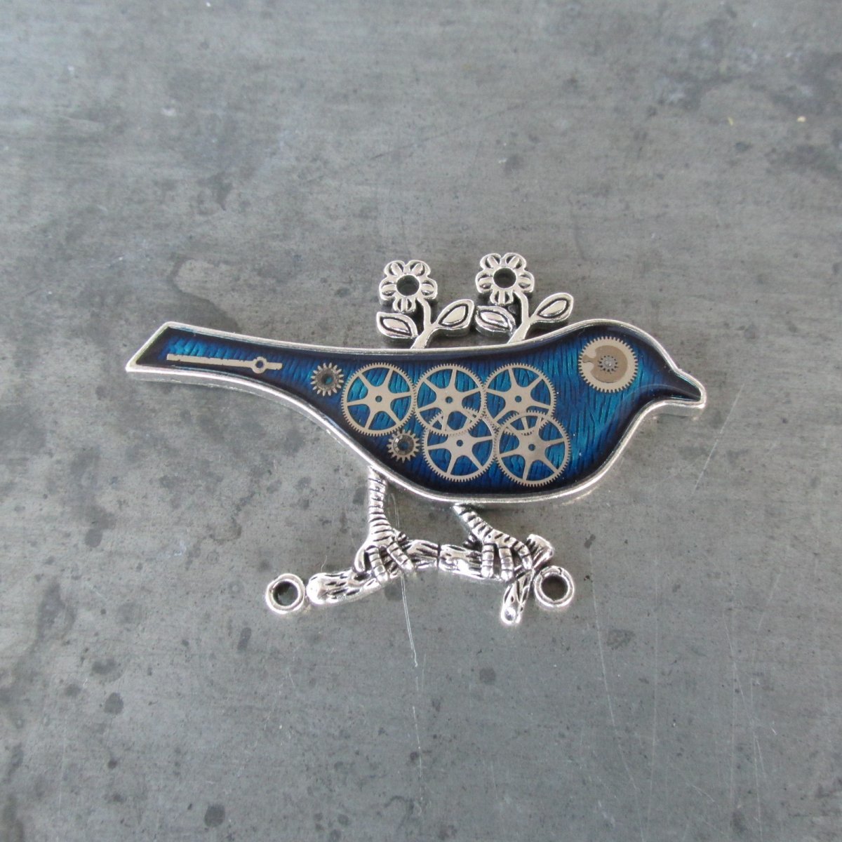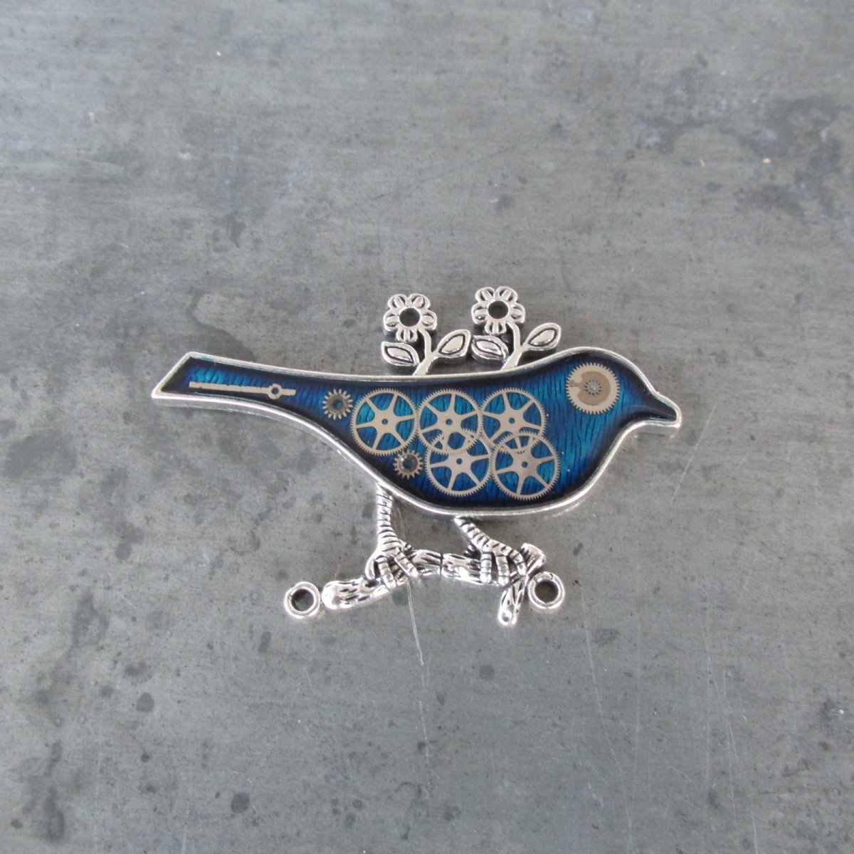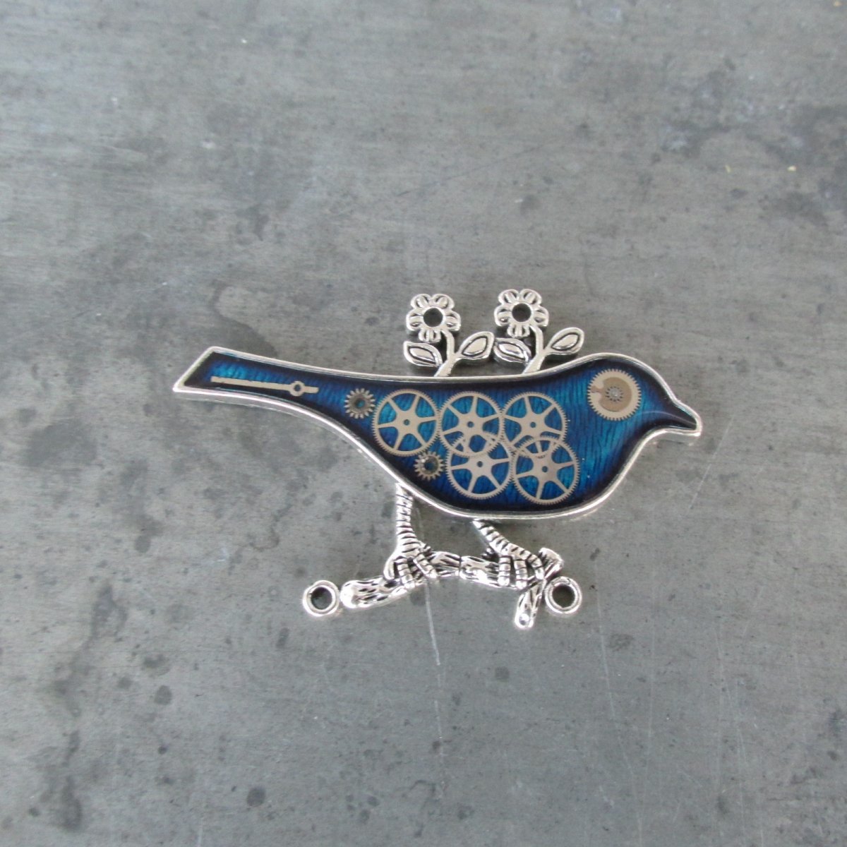 Originální elegantní brož.V OZDOBNÉM STŘÍBRNÉM PTÁČKU BAREVNĚ PODBARVENÉM JSOU ZALITY V LESKLÉ KŘIŠŤÁLOVÉ PRYSKYŘICI SOUČÁSTKY Z HODINEK PRIM, CELKOVÁ VELIKOST JE 4x6cm.
