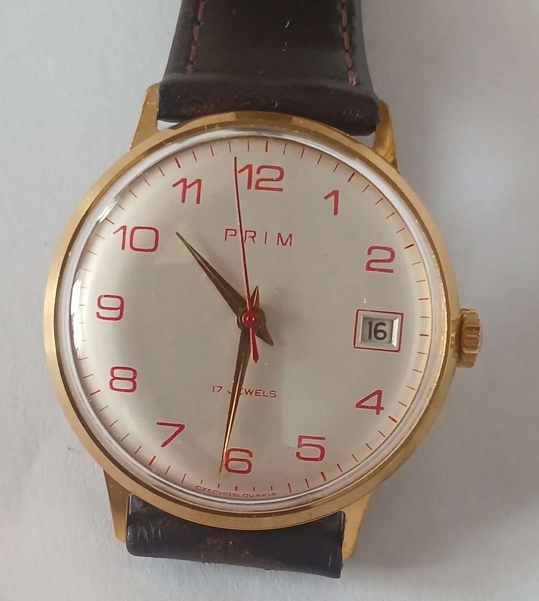 Velmi zachovalé, nenošené hodinky PRIM s červenými indexy
