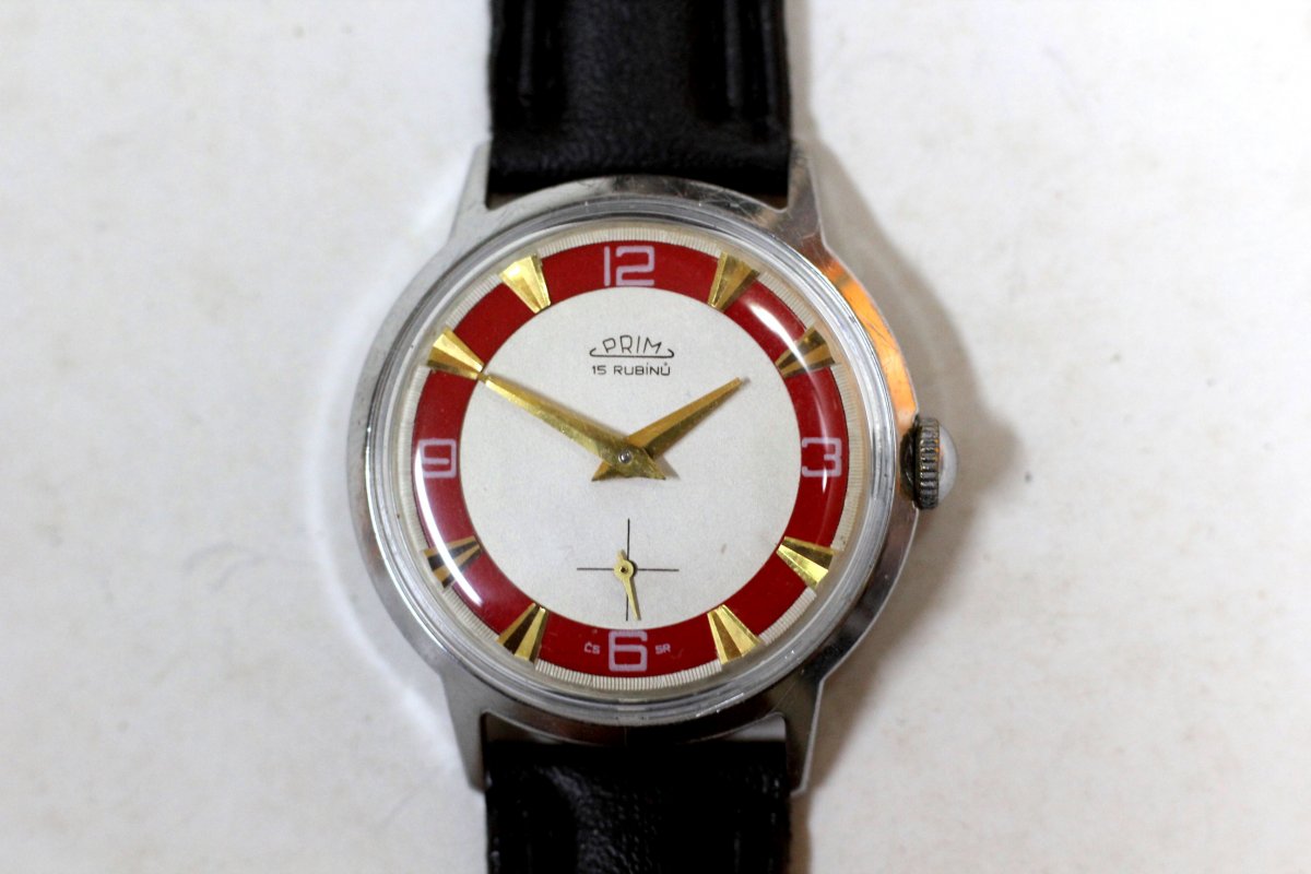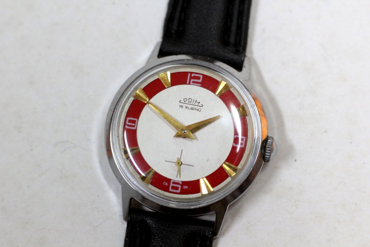 pánské hodinky Prim, model sorelo, červené mezikruží, perfektní stav, funkční