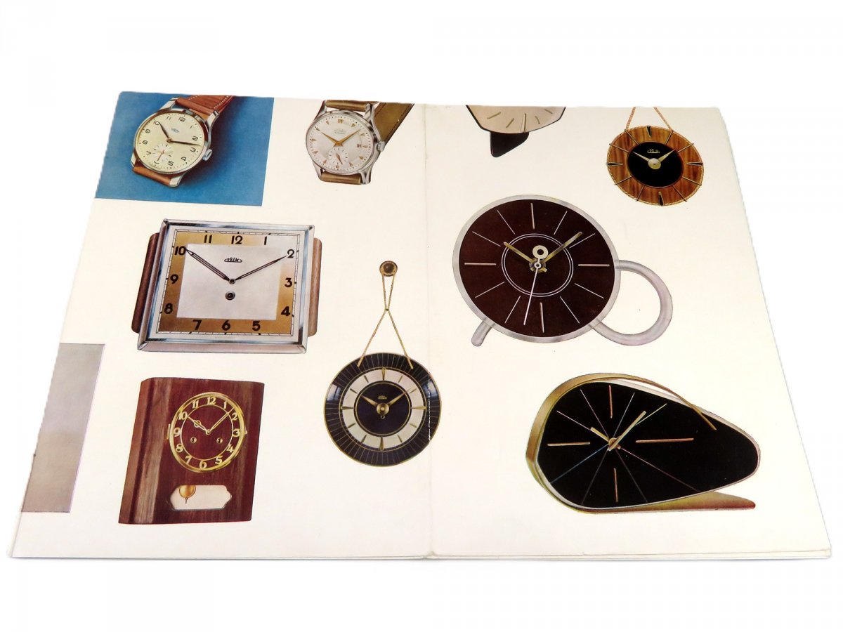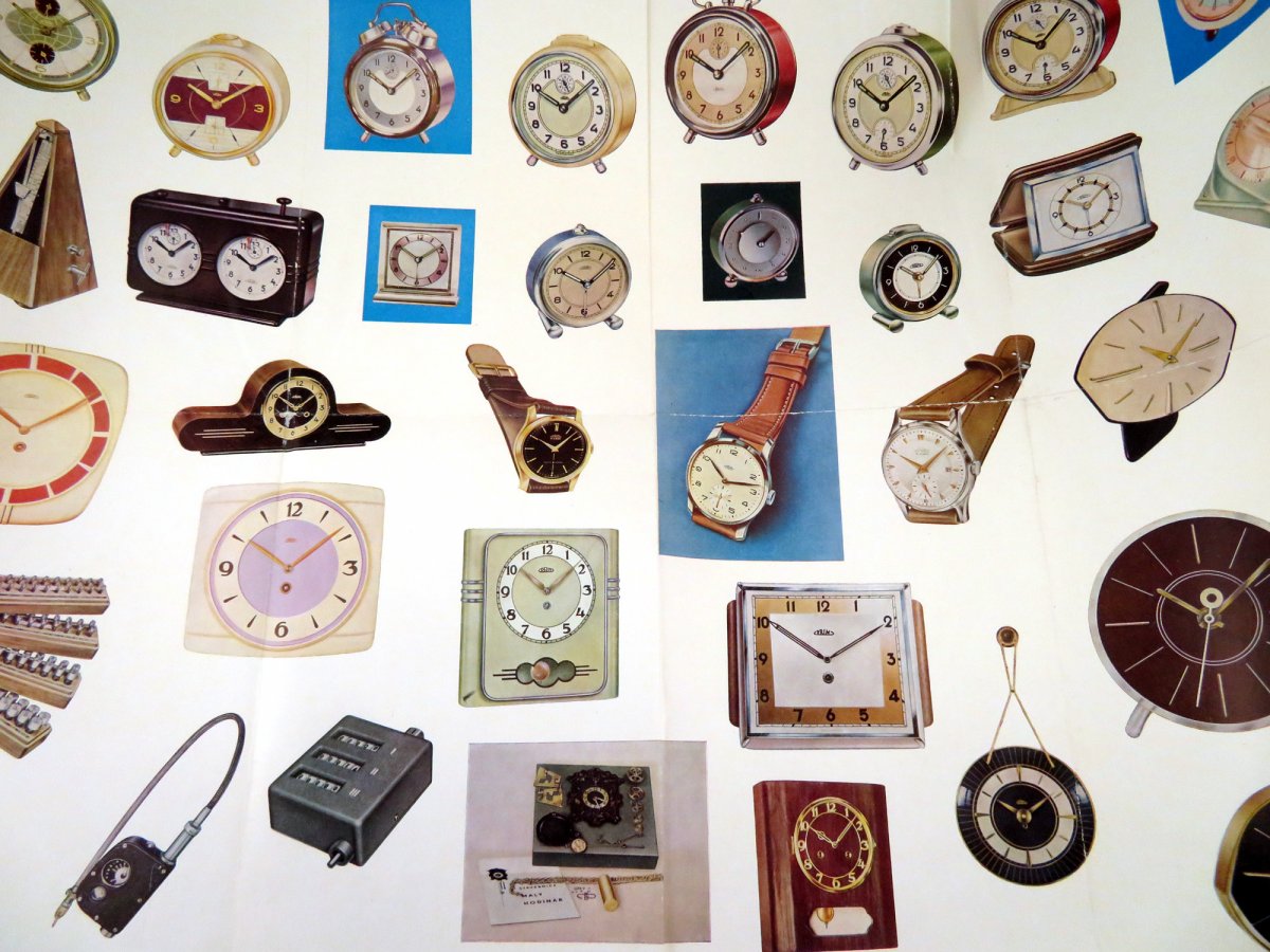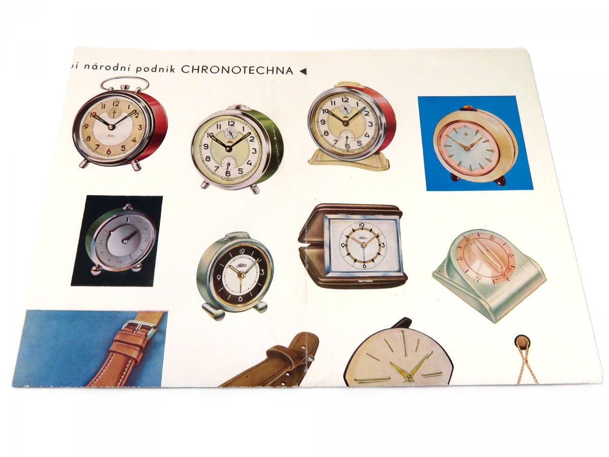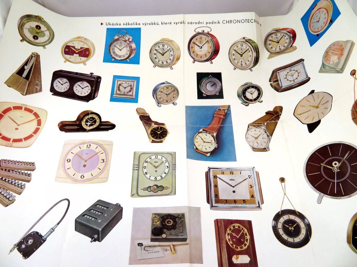 Plakát z roku 1962 o rozměrech 40 x 57 cm na kterém jsou zobrazeny výrobky, které na počátku 60. let minulého století produkovaly závody Chronotechny - hodiny, budíky, náramkové hodinky, minutky a pod.