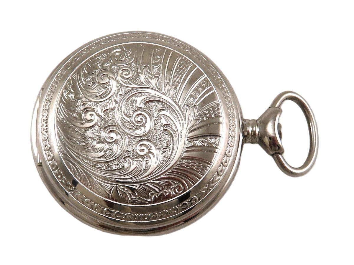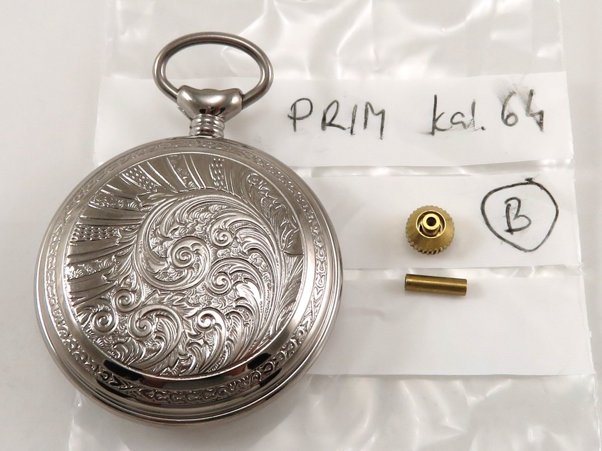 Vzácné chromované pouzdro na kapesní hodinky Prim z poloviny 90. let. V tomto případě s dekorativním ornamentem. Vyráběly se dvě verze těchto hodinek. S datumem a bez datumu. V obou byl použitý strojek Prim kal. 64. Jednou s číselníkem s datovým okénkem a podruhé bez datového okénka. Pouzdro je vyrobené ve Švýcarsku a je včetně vložky strojku, korunky a trubky korunky. Bohužel KORUNKA JE ZLACENÁ, NIKOLIV CHROMOVANÁ. Průměr pouzdra 48 mm. Stav viz foto.