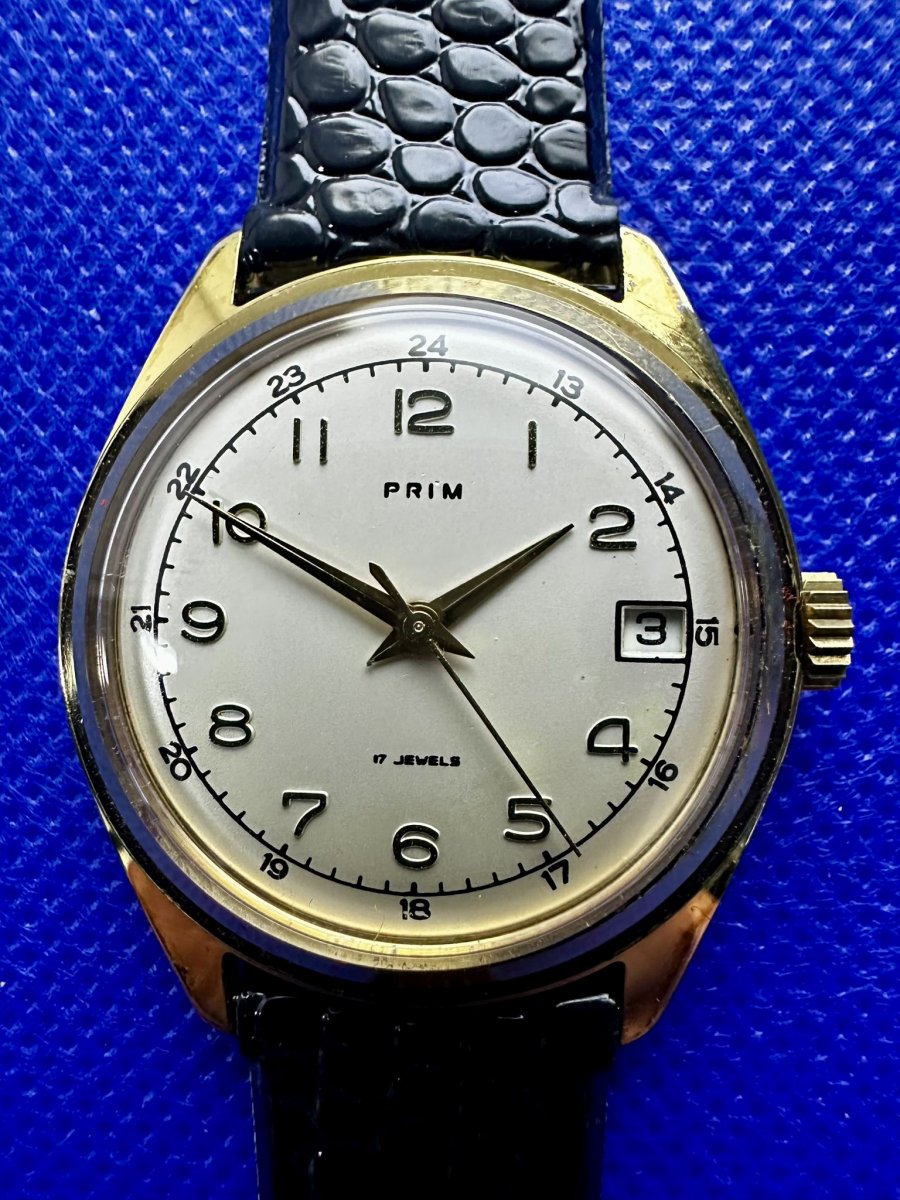 Strojek PRIM Kalibr 64 ve zlaceném pouzdře s manuálním nátahem o průměru 3č mm.