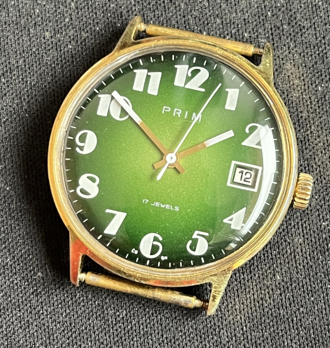 Prodám hodinky Prim typové označení 68 404 3 pozlacené, zelený čísleník s velkými ciframi a datumem. Stav viz foto, hodinky funkční, po servisu. Posílám ZÁSILKOVNOU.
