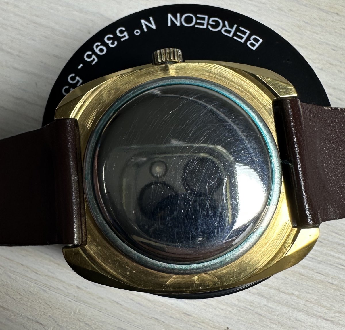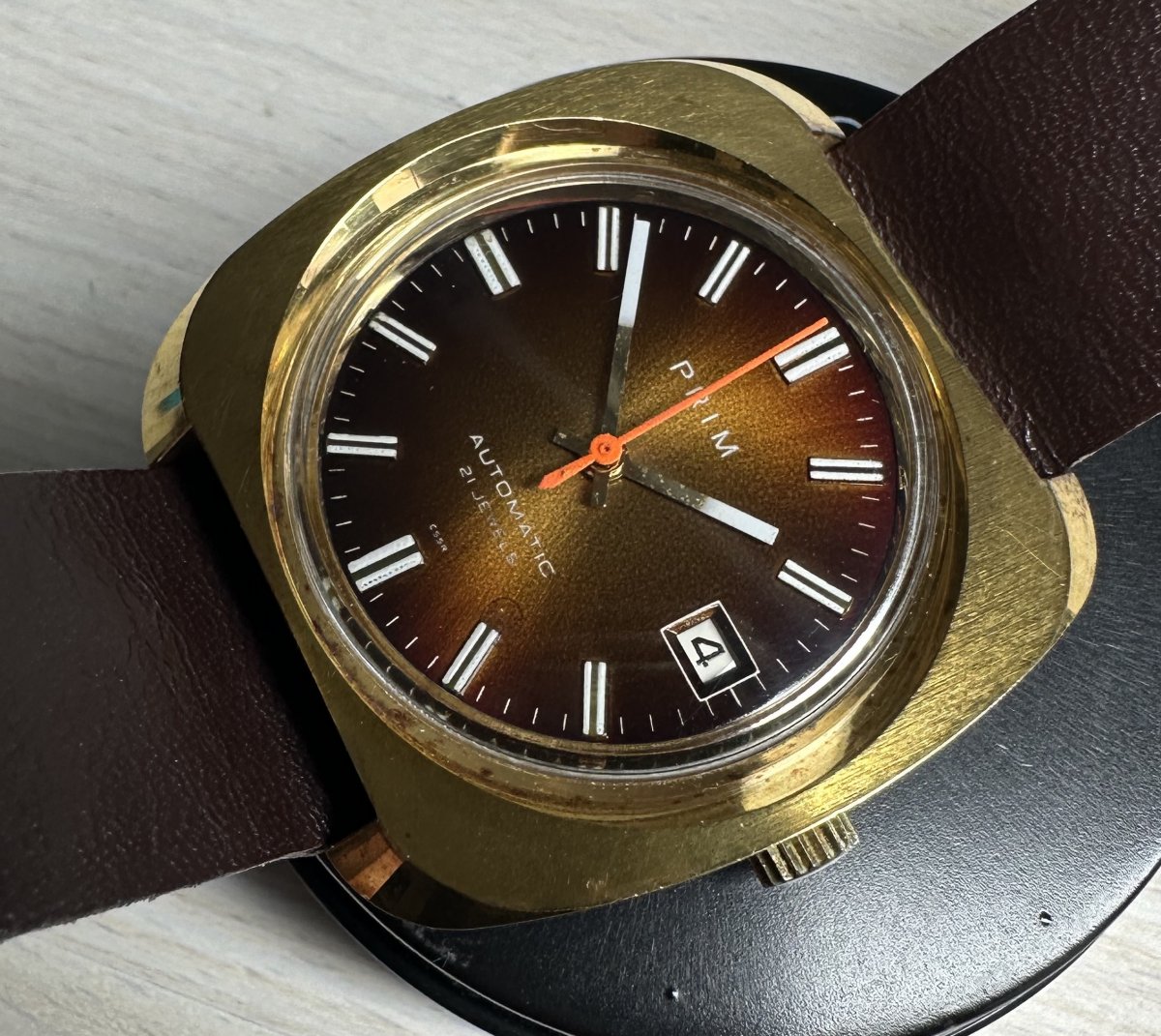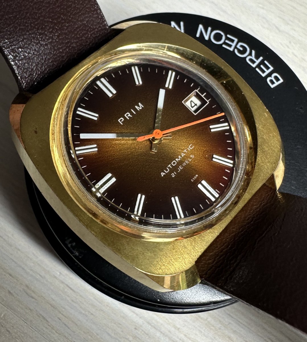 PRIM Automatic 96 008 3, rozmery púzdra 37 x 39 mm, funkčné, presné, pôvodný remienok Saturn Praha hnedej farby, zbytky pôvodnej ochrannej fólie na dne - dýnku, top pôvodný stav viď. fotografie.