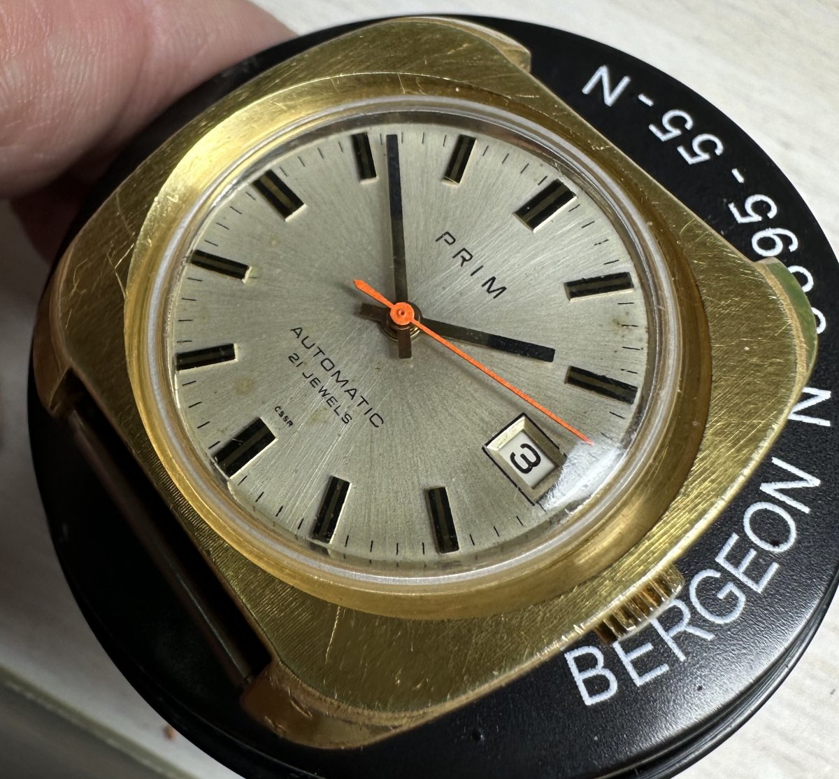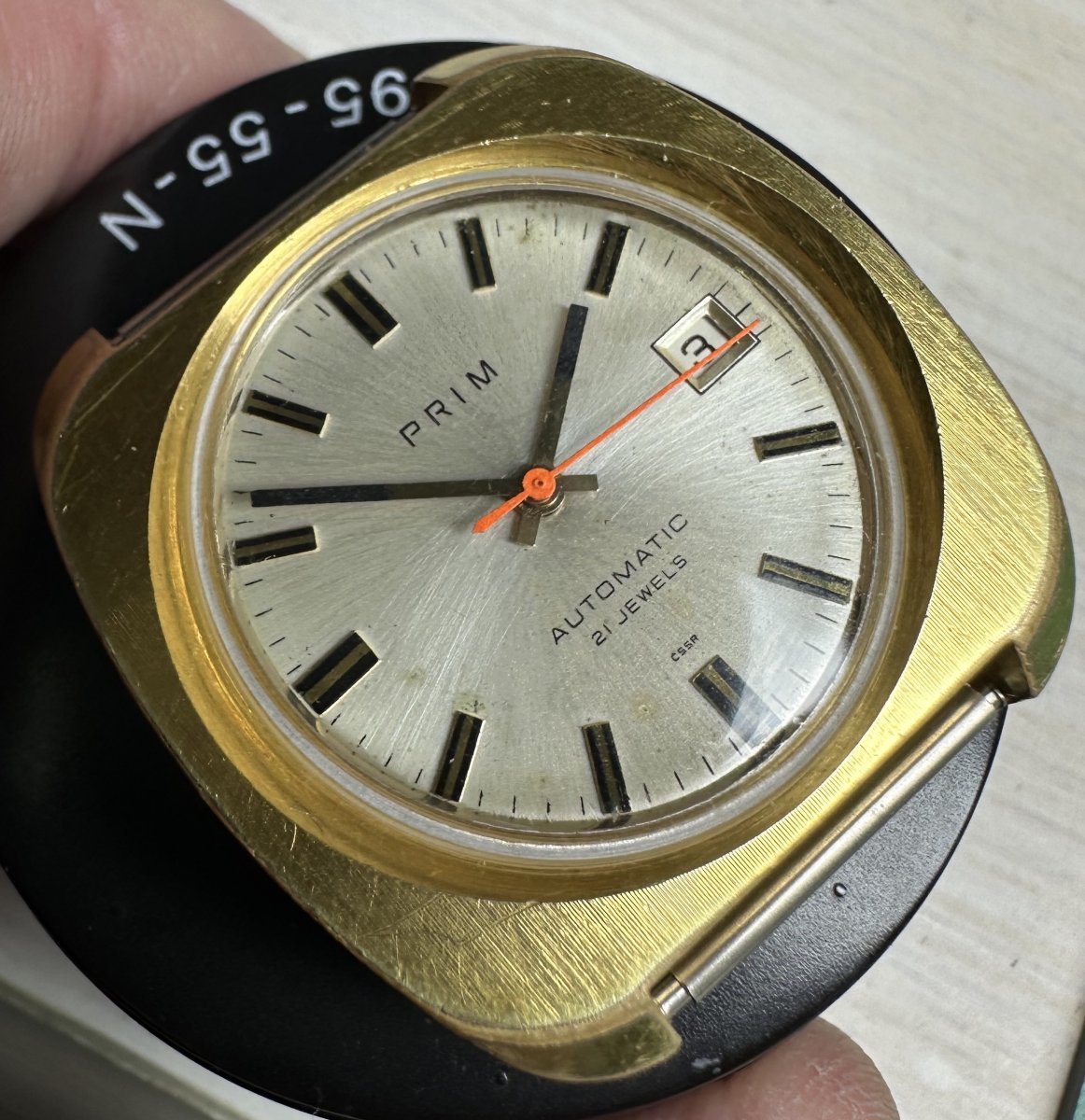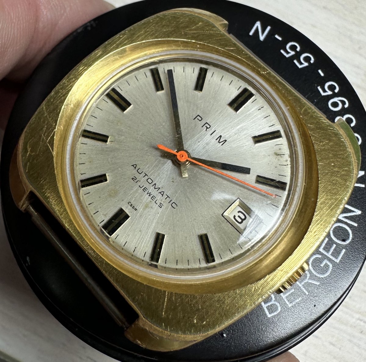 PRIM Automatic 96 009 3, rozmery púzdra 37 x 39 mm, nálezný stav, funkčné, presnosť a dĺžka chodu nesledované, stav viď. fotografie.