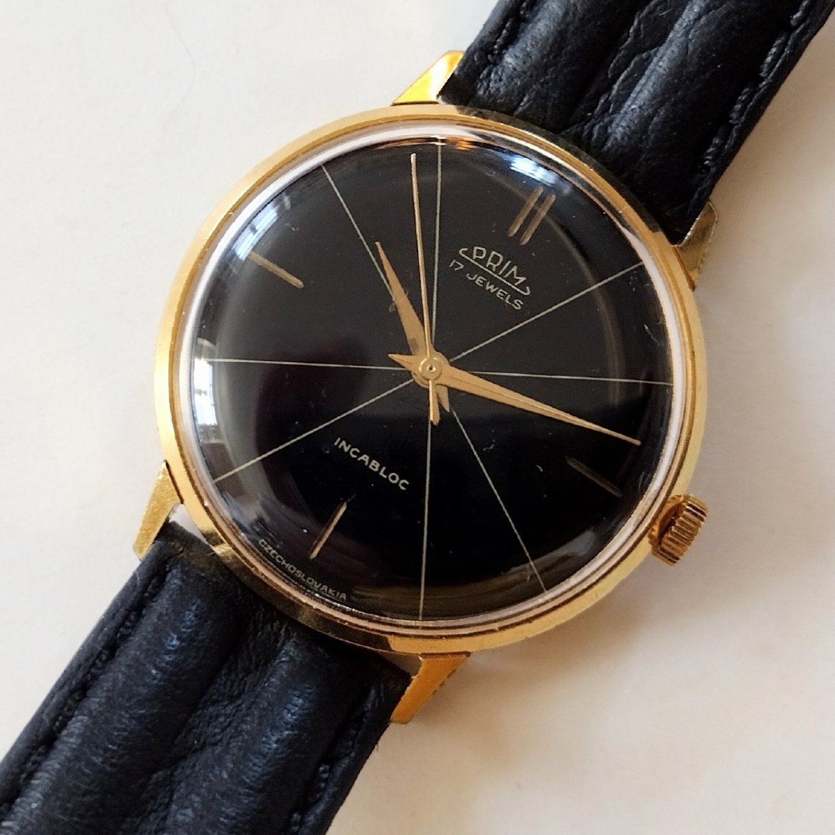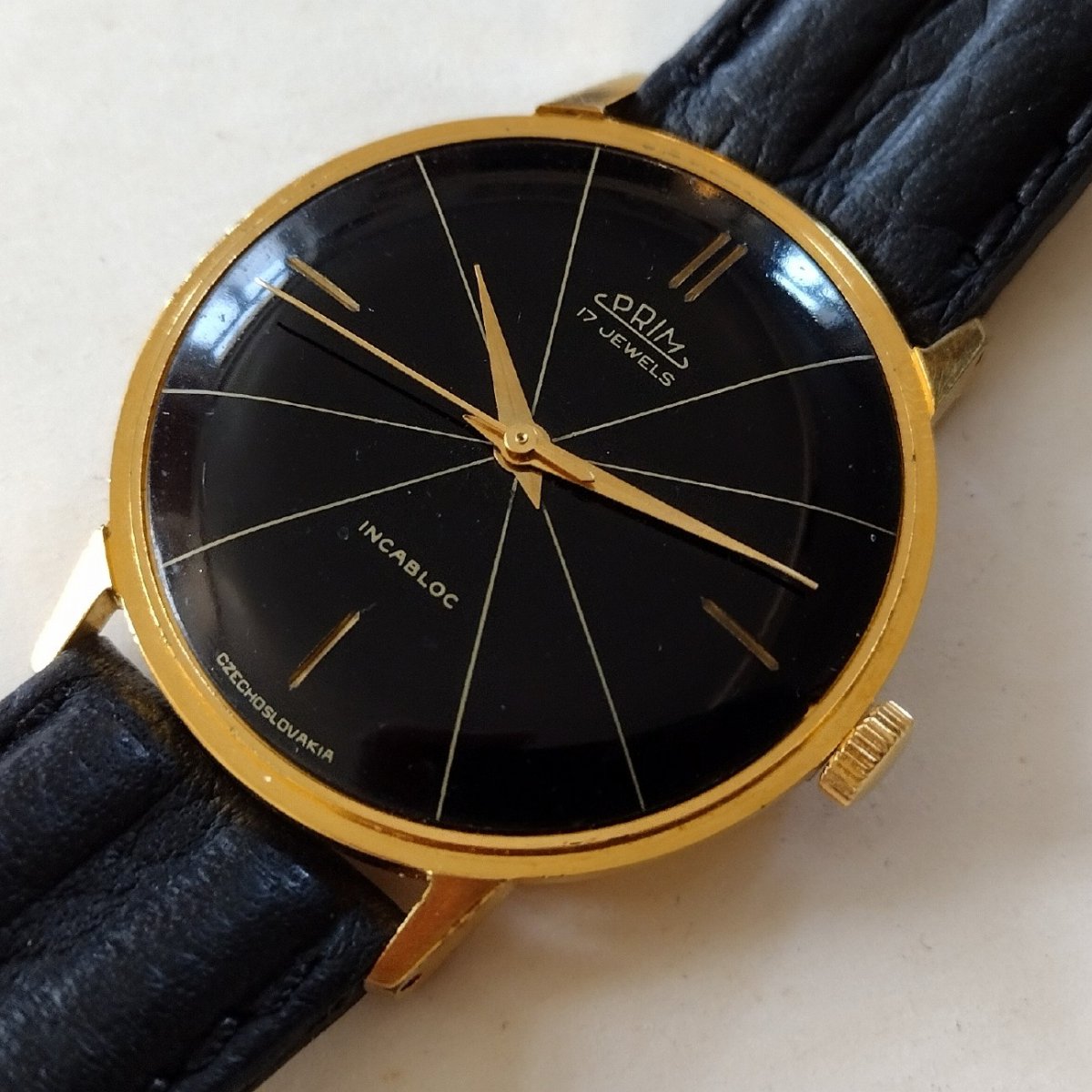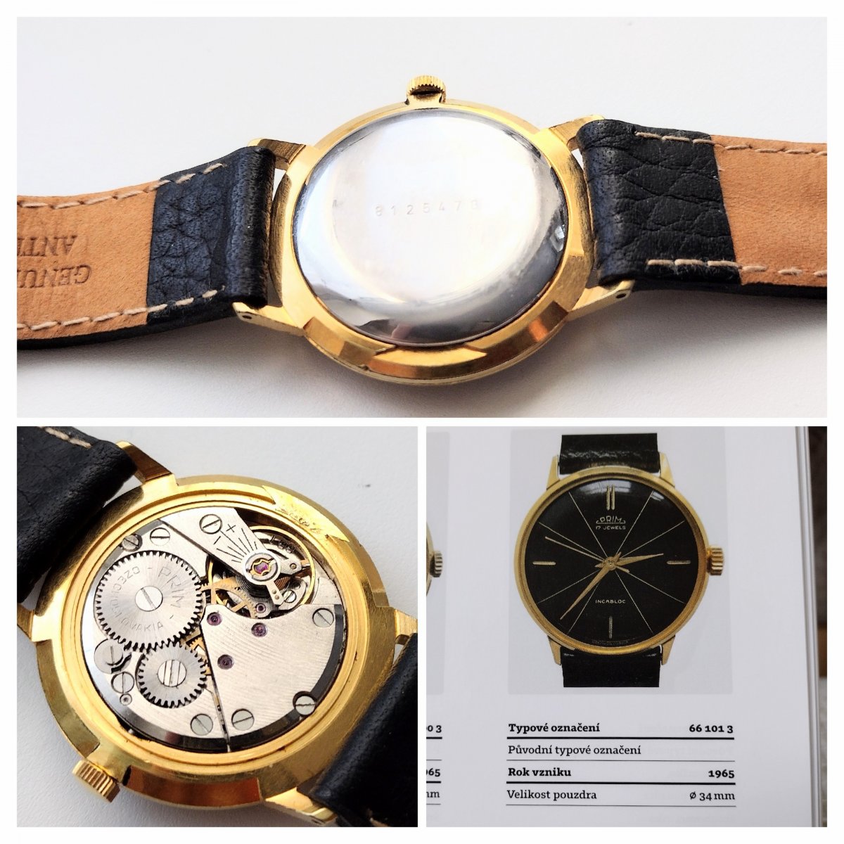 Vyjímečně zachovalé vyhledávané hodinky Prim. TOP původní lakovaný číselník, velmi zachovalé pouzdro, funkční strojek kalibr 66 - typ 66.1. (dvouramenná setrvačka a švýcarský tlumič nárazů - incabloc) tak jak má přesně patřit k tomuto modelu. Lehké stopy svátečního používání, krásný sbírkový kus. Kvalitní kožený řemen.