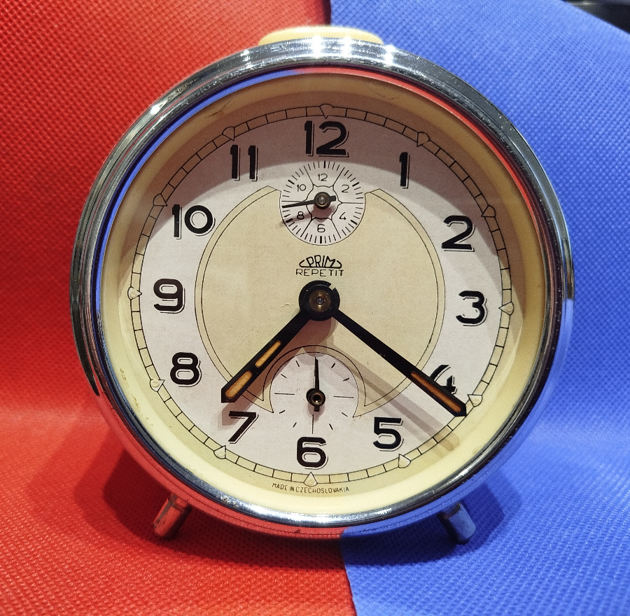 Ponukam funkčny budik s funkciov Repetit / opakovane zvonenie /ktore je funkčne,strojček vo vnutry je 100C logo chronotechna,skličko ma male strbiny na okraji / odfotene /