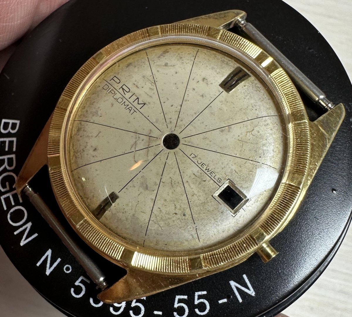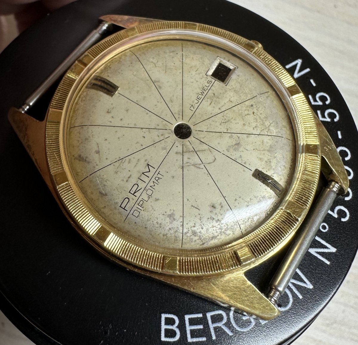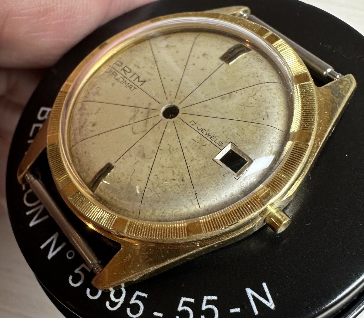 PRIM Diplomat, zachovalé púzdro s číselníkom a s vložkou strojčeka, nové sklíčko, stav viď. fotografie.