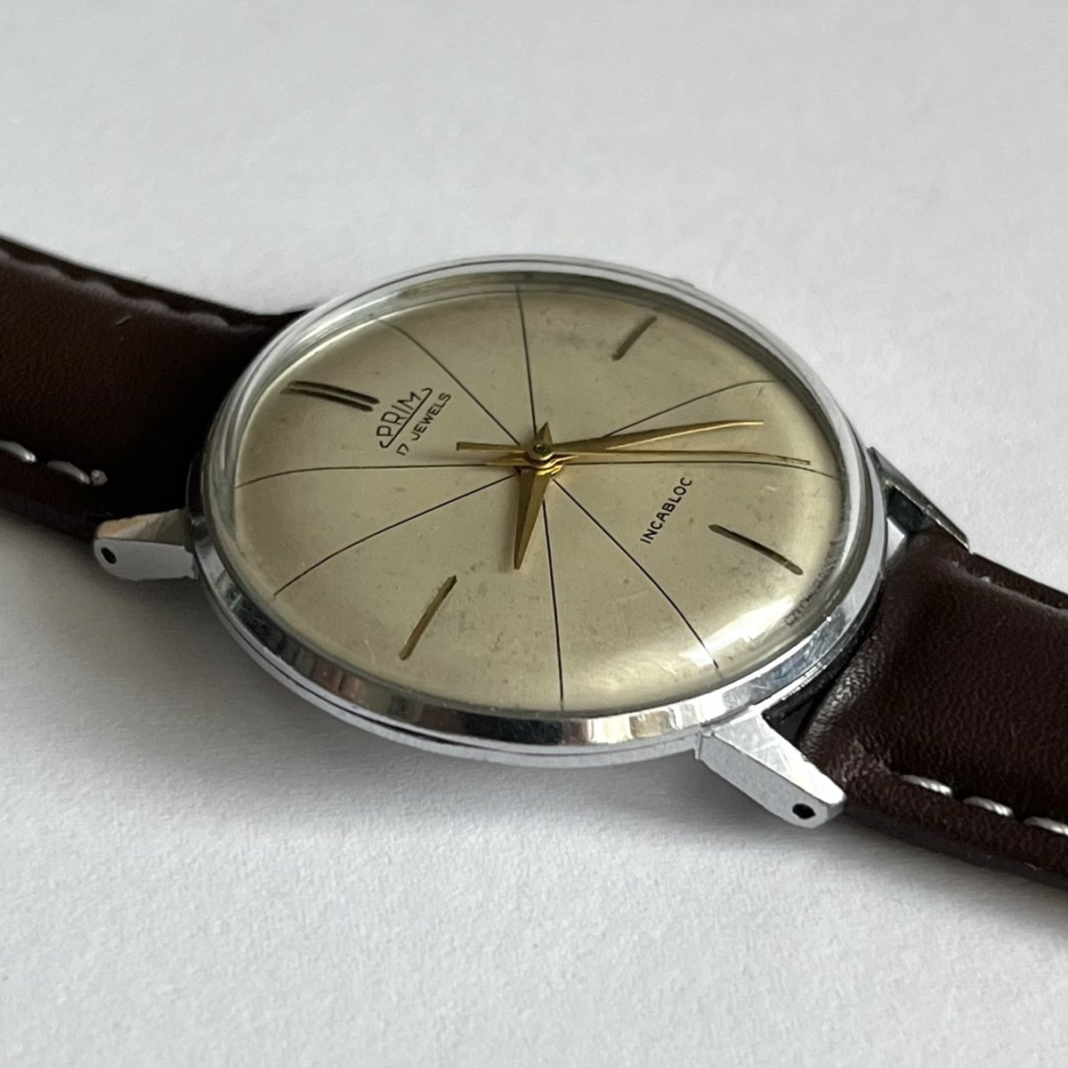 Funkční prim elegant,pěkné chromované pouzdro,strojek incabloc čistá 66,dvouramenná setrvačka,nový řemínek,vzhledem ke stáří bez záruky