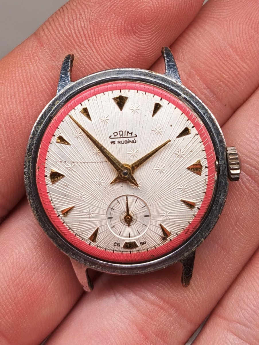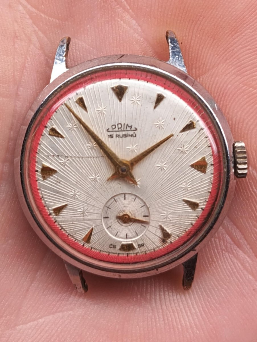 Nabízím Prim Hvězdičky ve vzácné variantě s červeným pruhem na ciferníku. Hodinky v původním stavu. Strojek nefunkční, sklo prasklé. Stav viz foto.