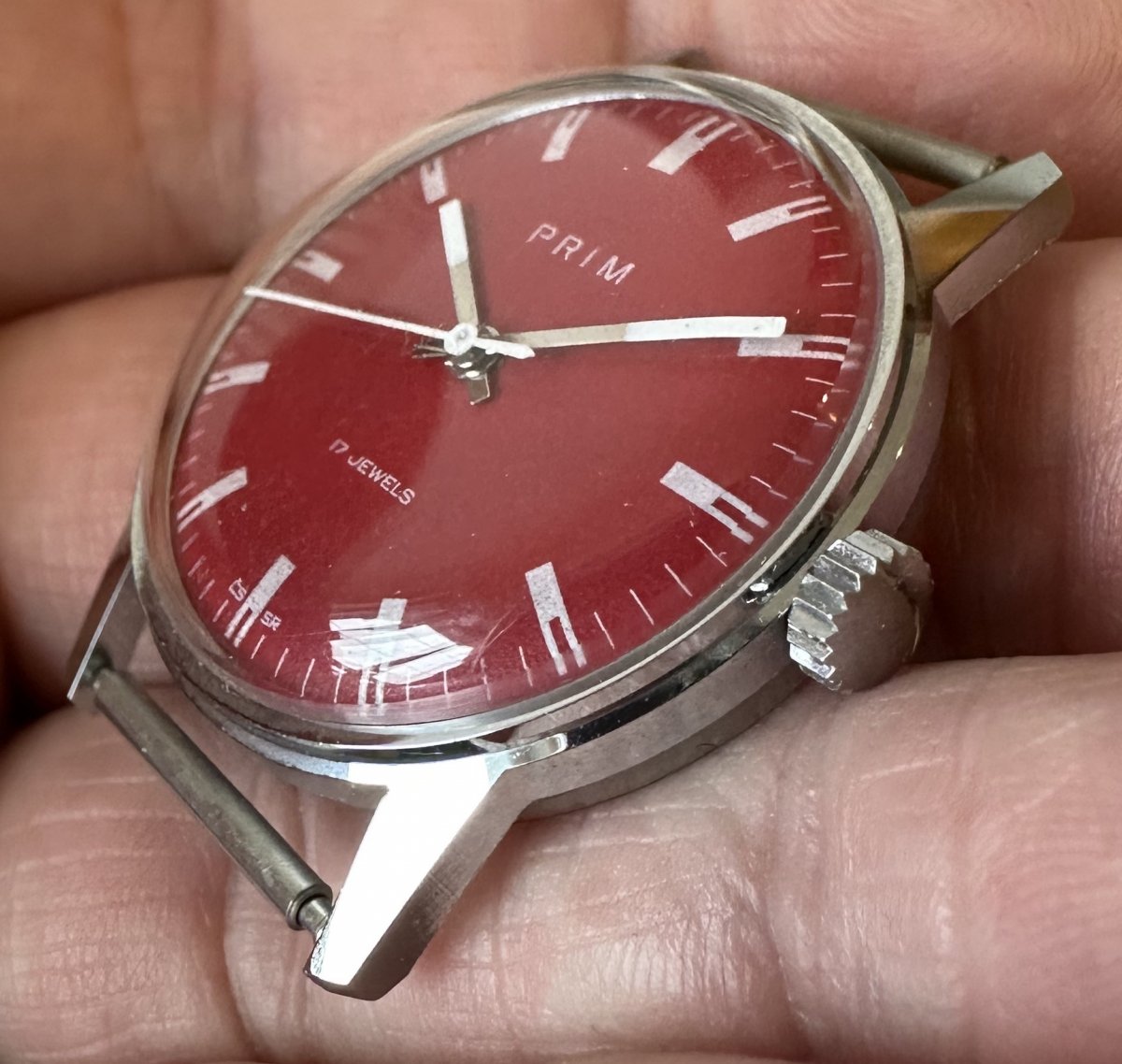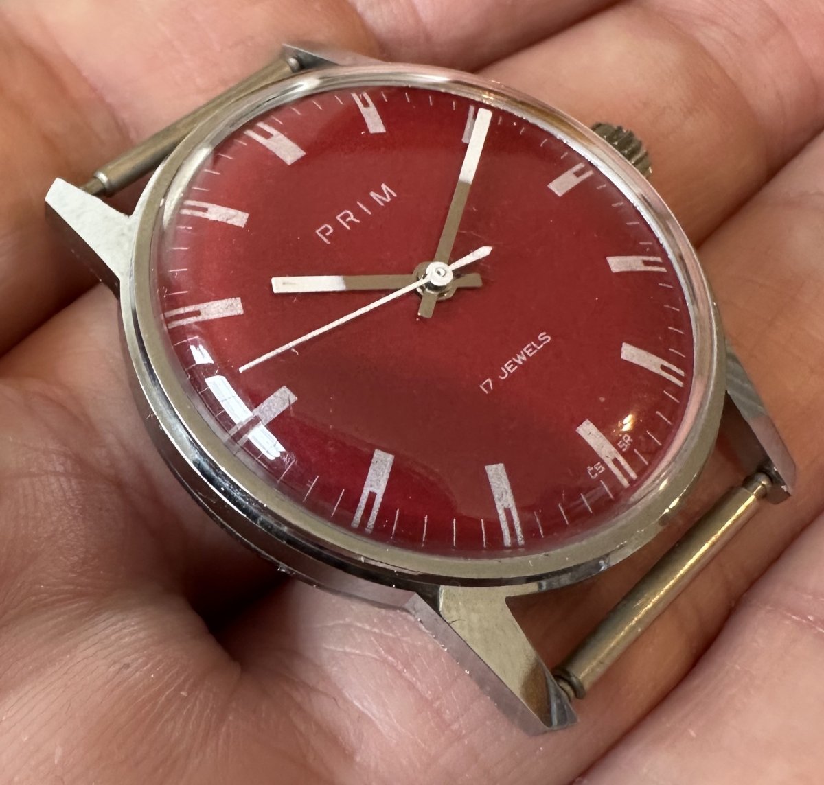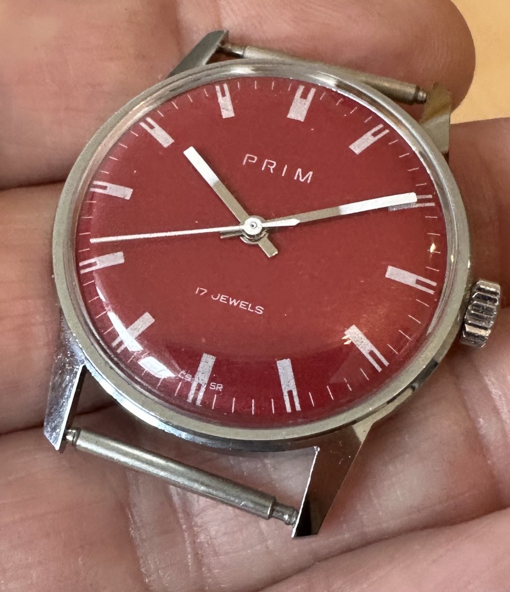 PRIM kal 66 s červeným číselníkom, priemer púzdra 32 mm, funkčné, presnosť a dĺžka chodu nesledované, nepoužitý stav viď. fotografie.