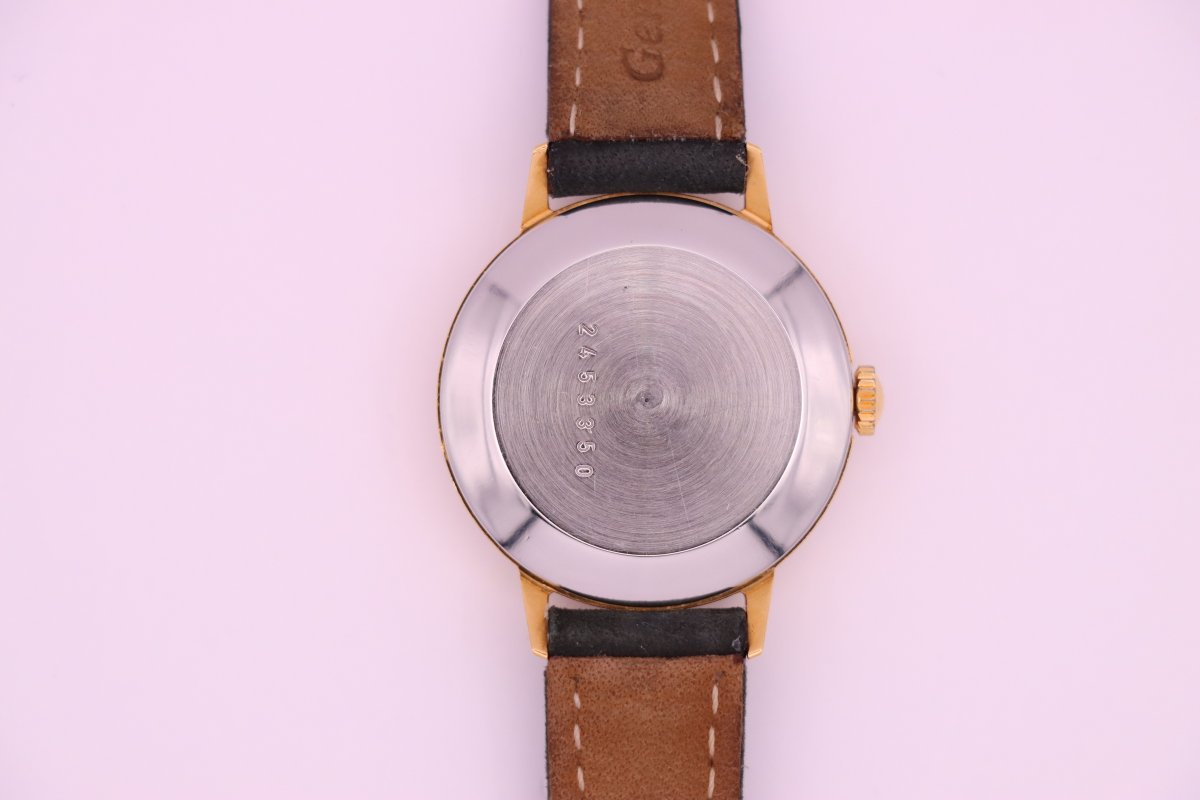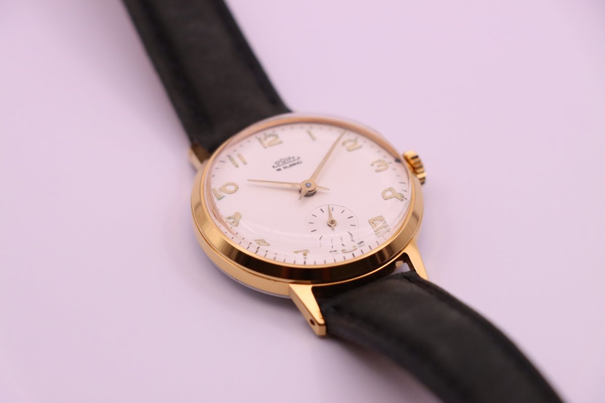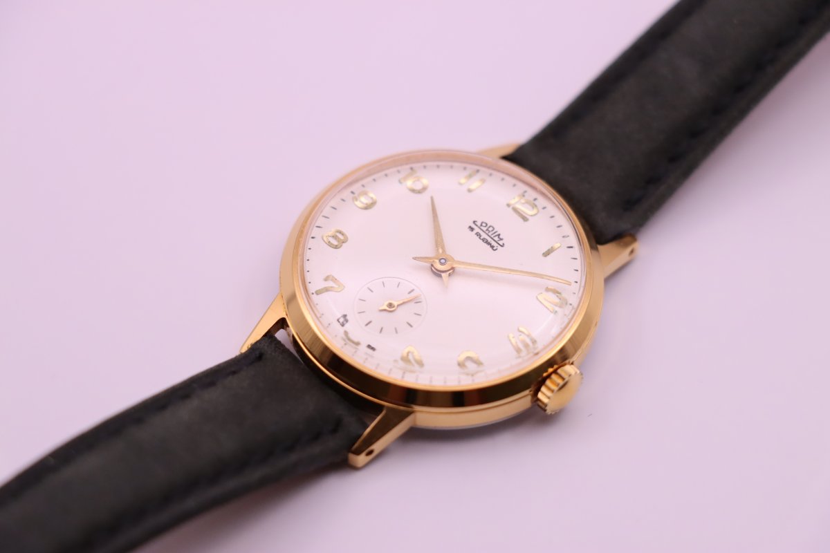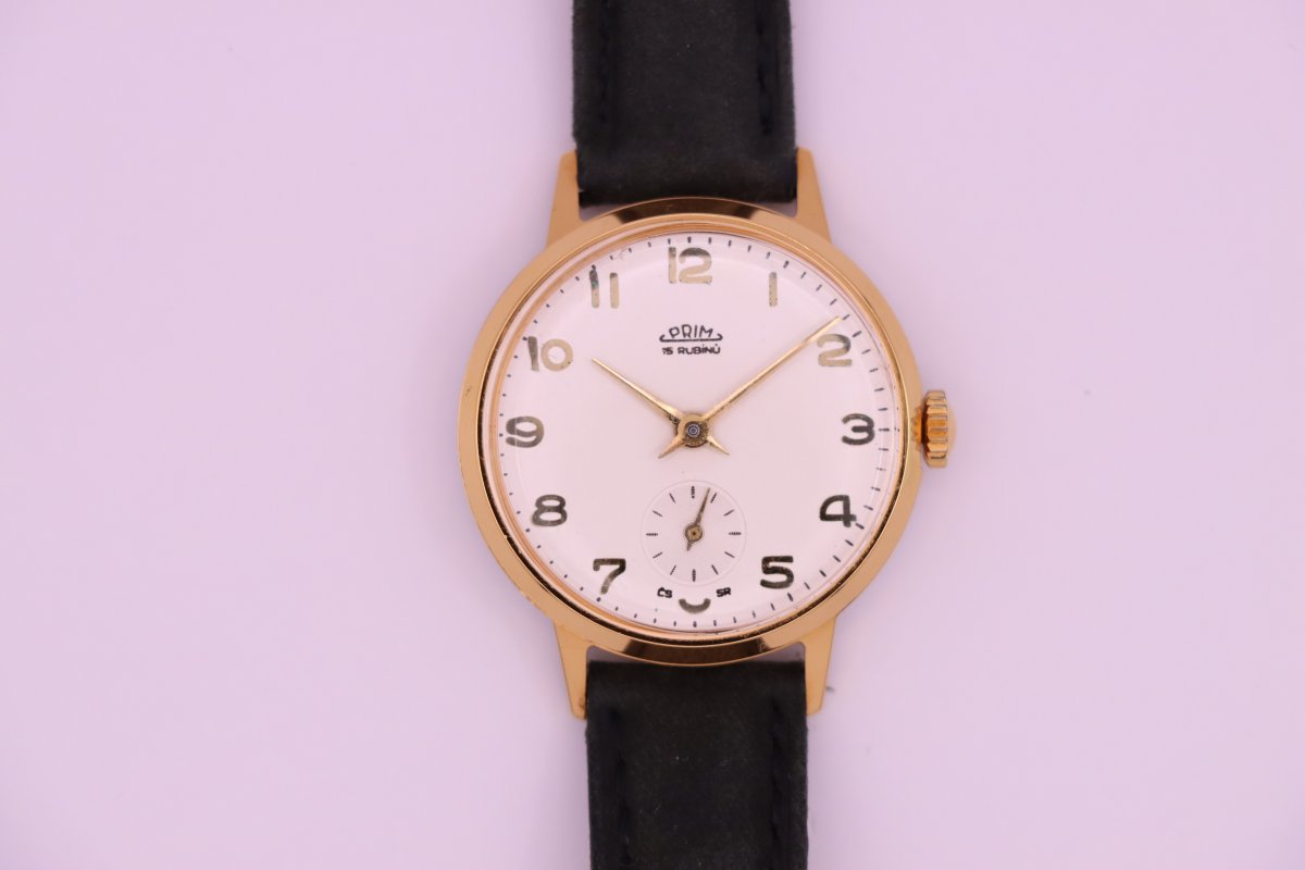 Prim kalibr 50, zlacené pouzdro o průměru 30 mm, typ 50 117 3, 15 Jewels ve sbírkovém stavu, strojek 50 1, stav dle fotek, 1966, kožený řemínek Mavex.
