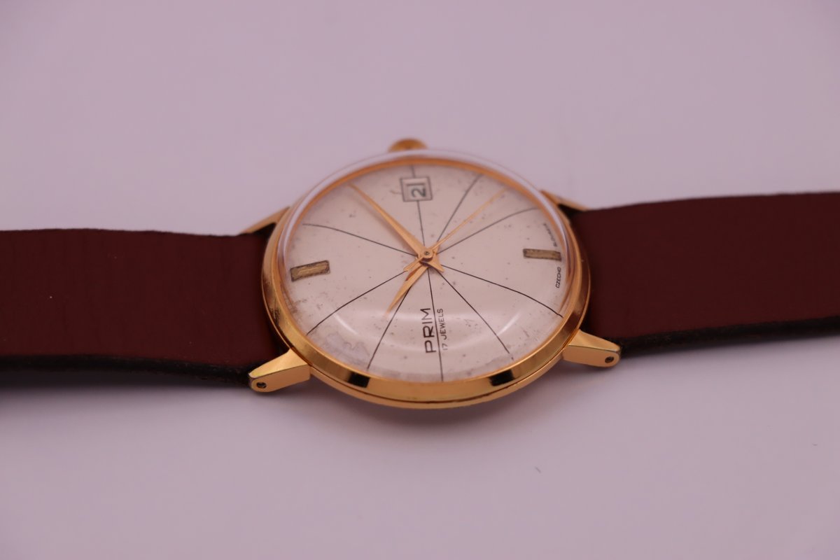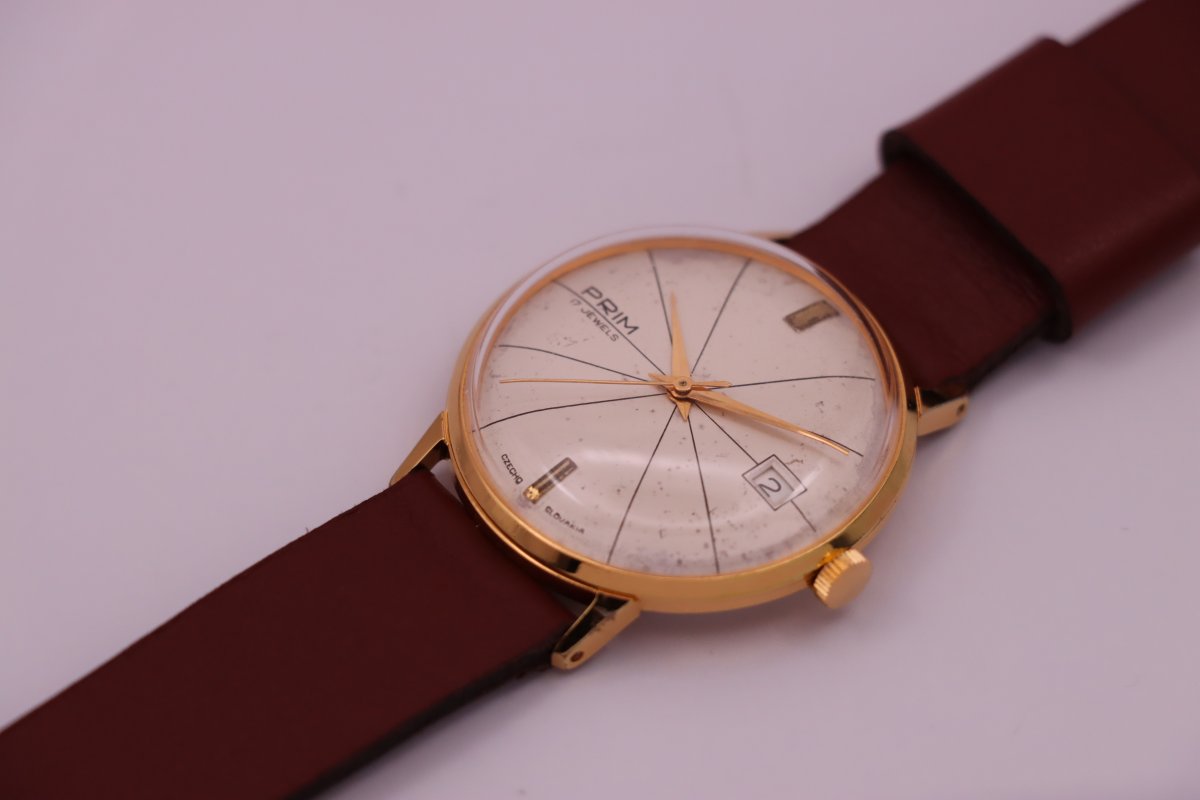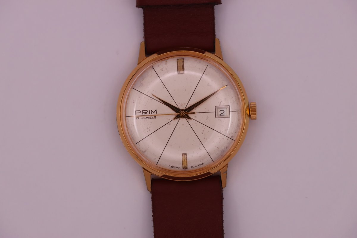 Prim kalibr 68, zlacené pouzdro, typ 68 144 03 z roku 1967, kožený řemínek není součástí nabídky, stav dle fotek.