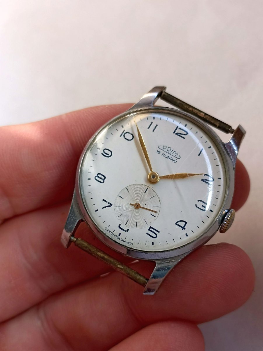 Staré pánské hodinky PRIM tzv. pospartak, velice pěkný, původní a funkční stav, strojek kal. K25. Vše viz foto.