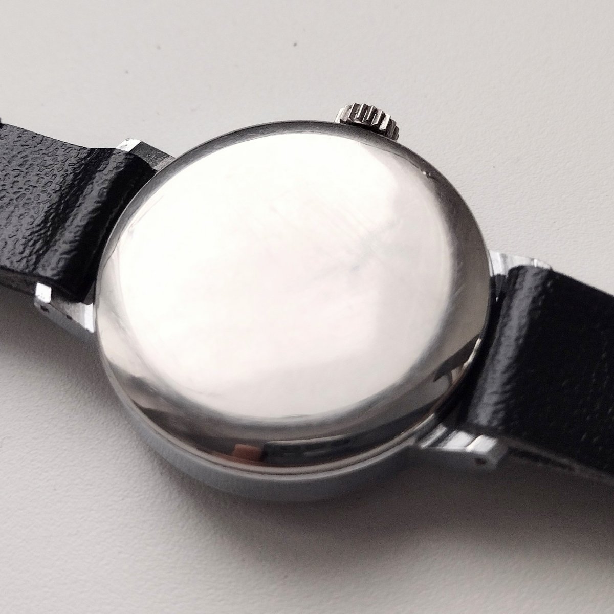 Na chromovaném pouzdře lehké stopy svátečního používání. Původní krabička a dobový berexový řemínek. Strojek kalibr 66, typ 66. chod bez výrazné odchylky. Vzhedem ke stáří bez záruky. Redukce sbírky