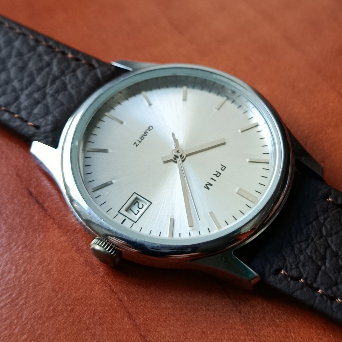 Prodám pánské hodinky PRIM Quartz z 90. let minulého století. Průměr hodinek je 34 mm, uvnitř pracuje quartzový strojek Ronda 715, plně funkční s novou baterií včetně nového řemínku.