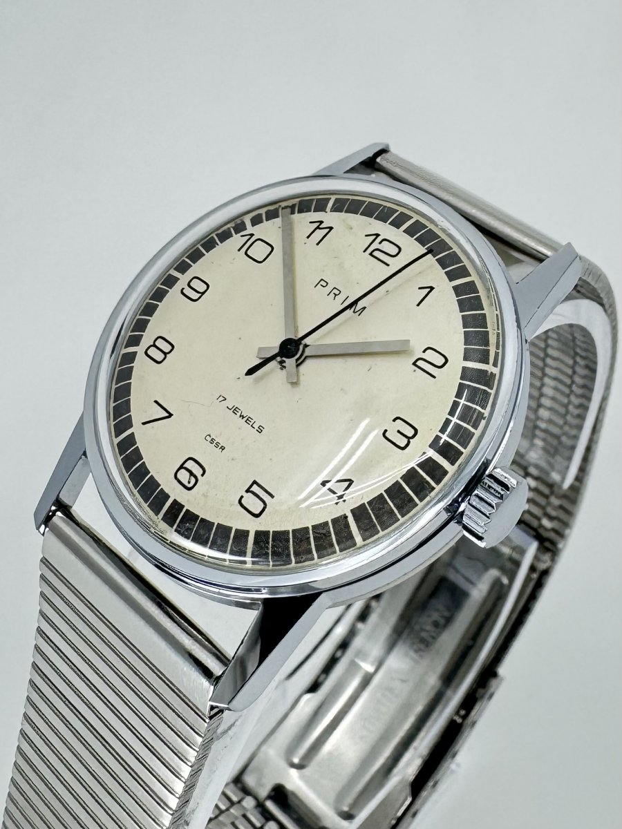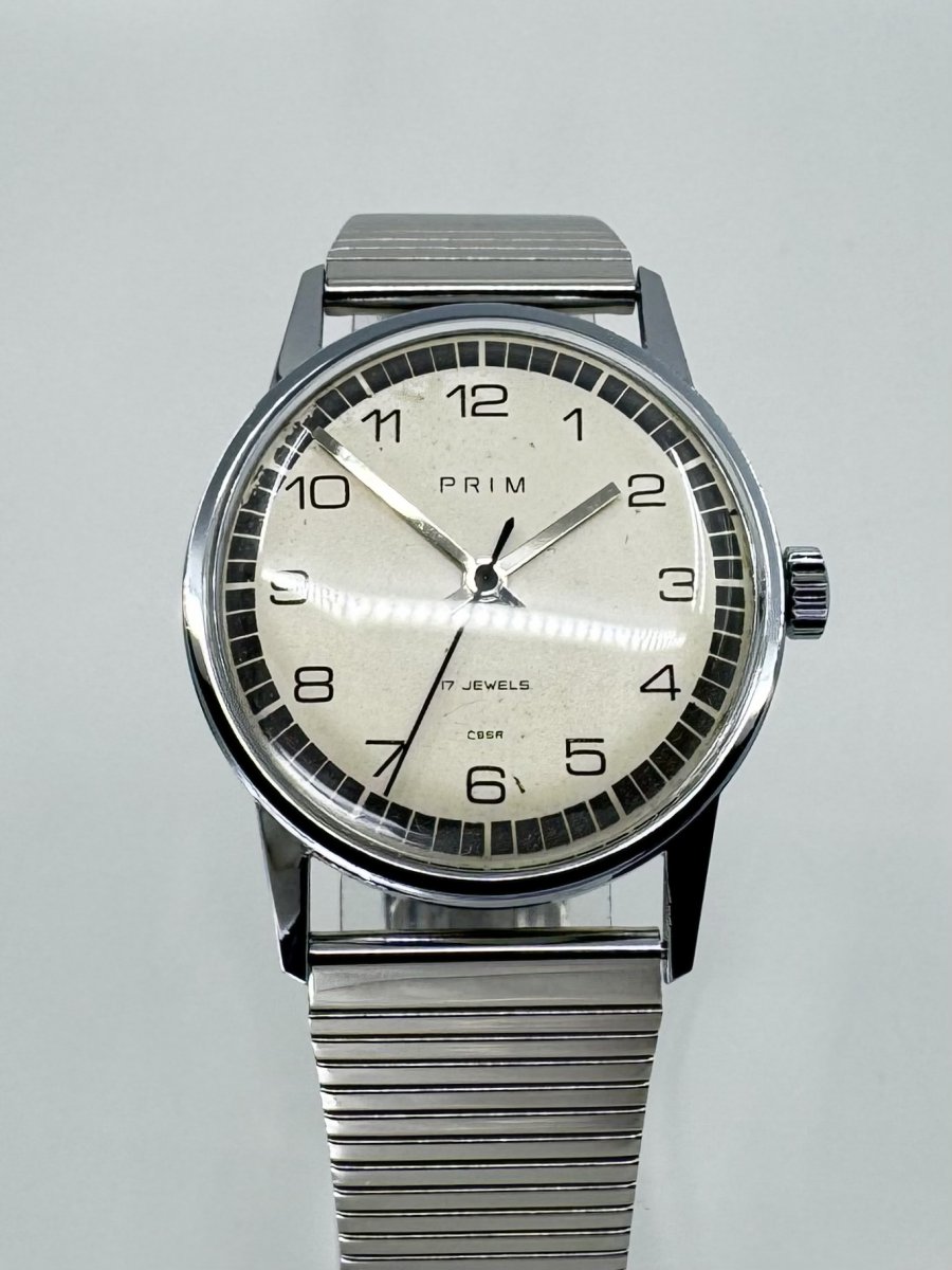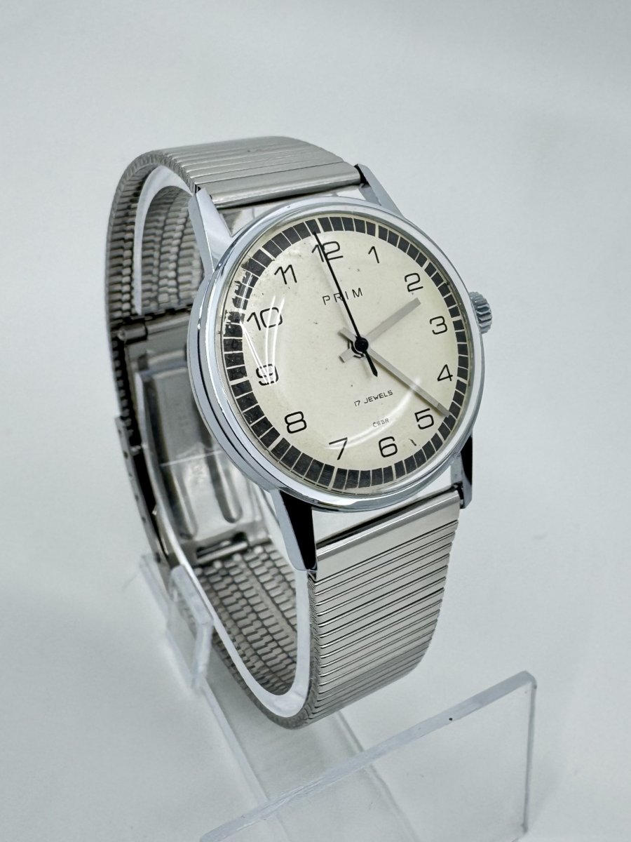 Hodinky PRIM se šedým minutovým okružím, katalogové číslo 66.305.1, vyrobené v roce 1975.