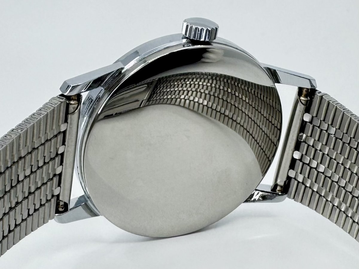 Chromované pouzdro je ve velmi dobrém stavu, s hezkým leskem a jen minimálními stopami nošení úměrnými věku. Hrany pouzdra jsou zachovalé, bez výrazných otluků, stejně jako zaklapávací dýnko. Korunka je originální, dobře se ovládá.