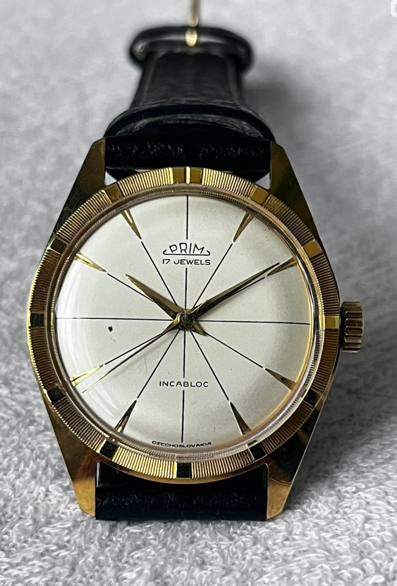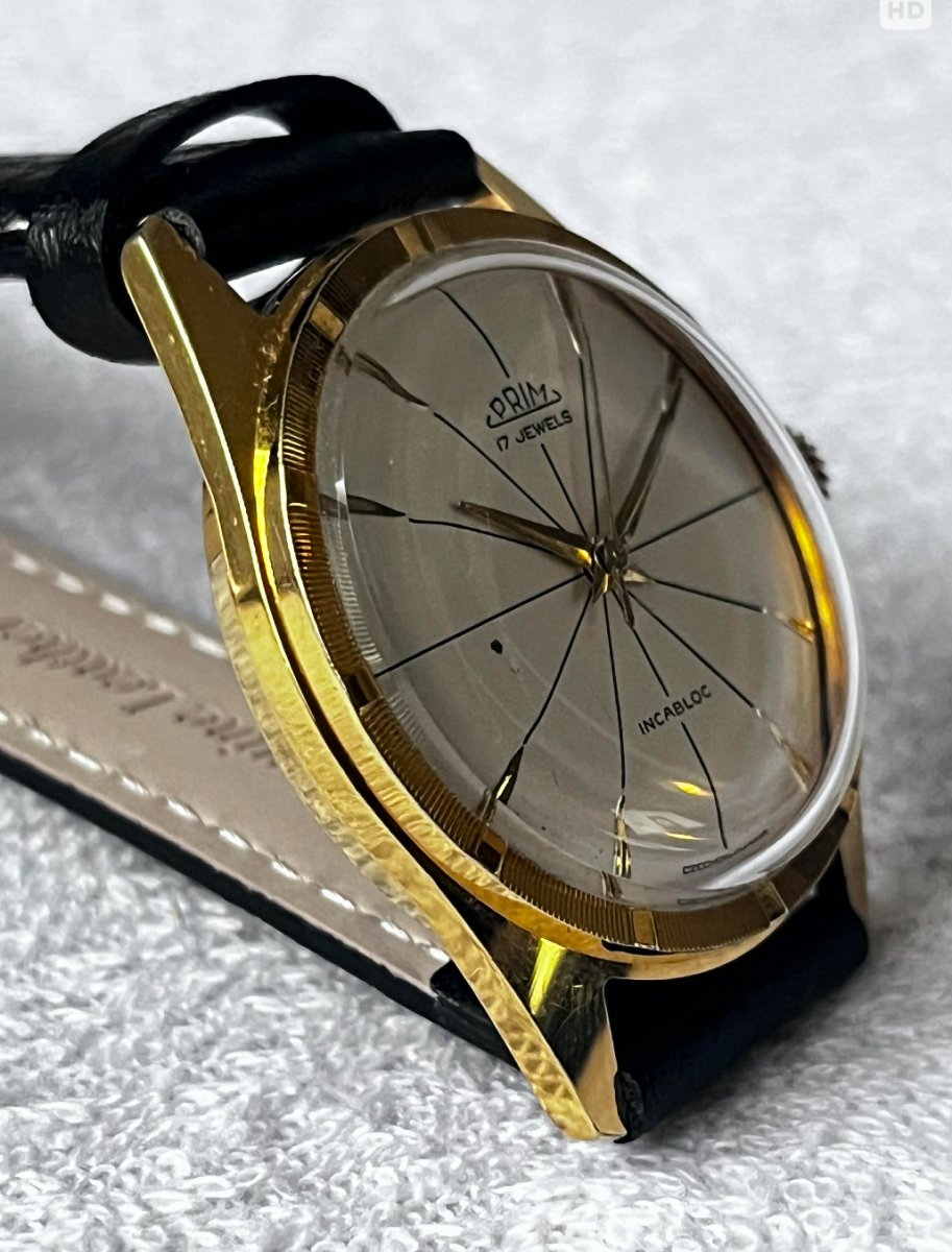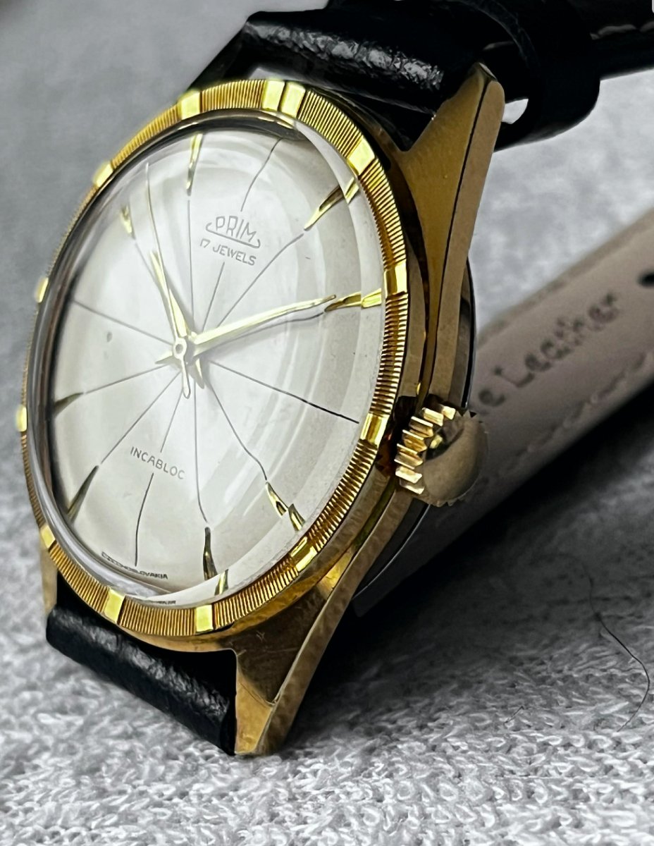 Vyžazuju ze sbírky tyto krásné pánské hodinky Prim se šipokovými indexy v ve zlatém provedení. Krásně zachovalý ciferník, originální pozlacené pouzdro a korunka.