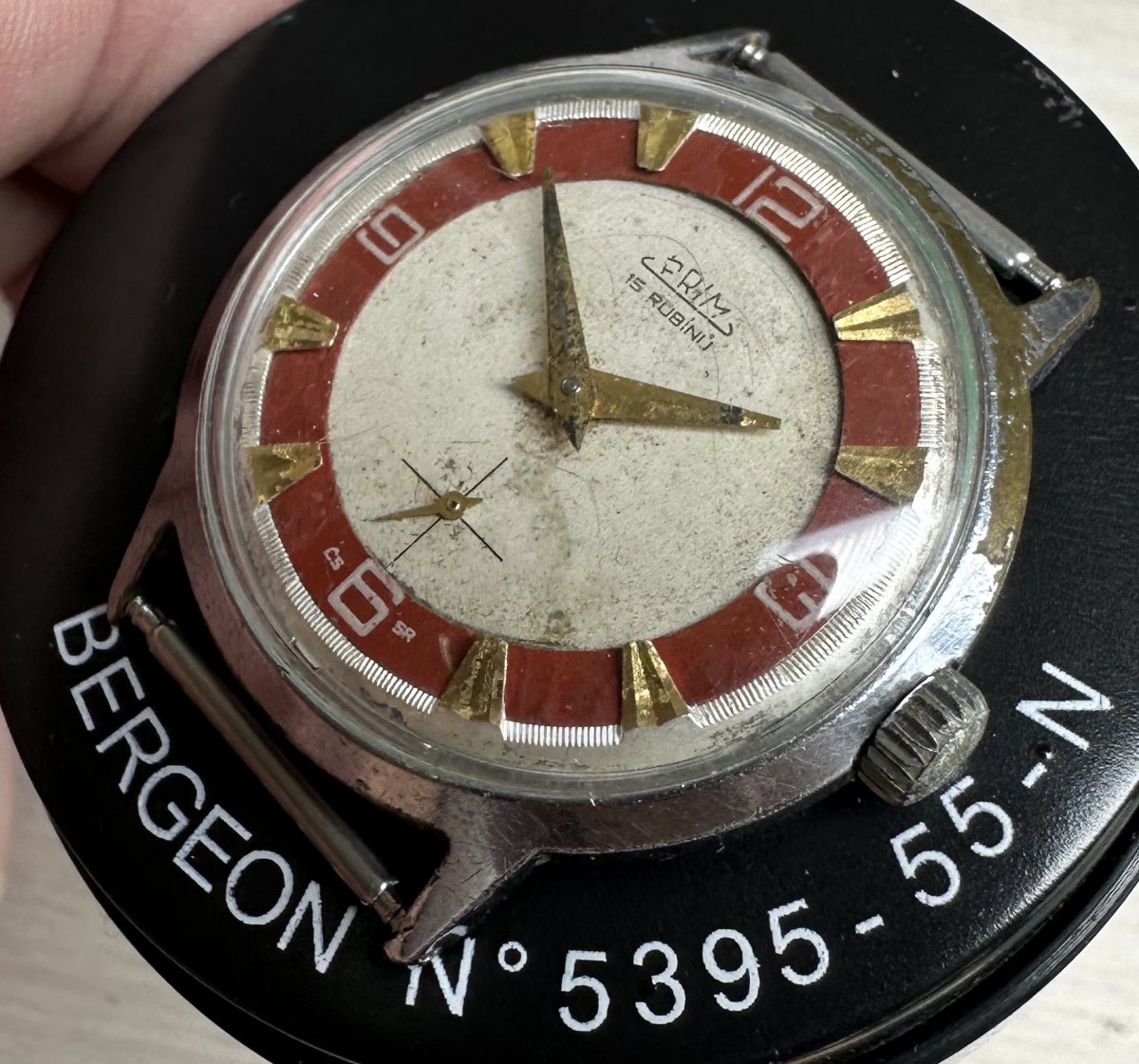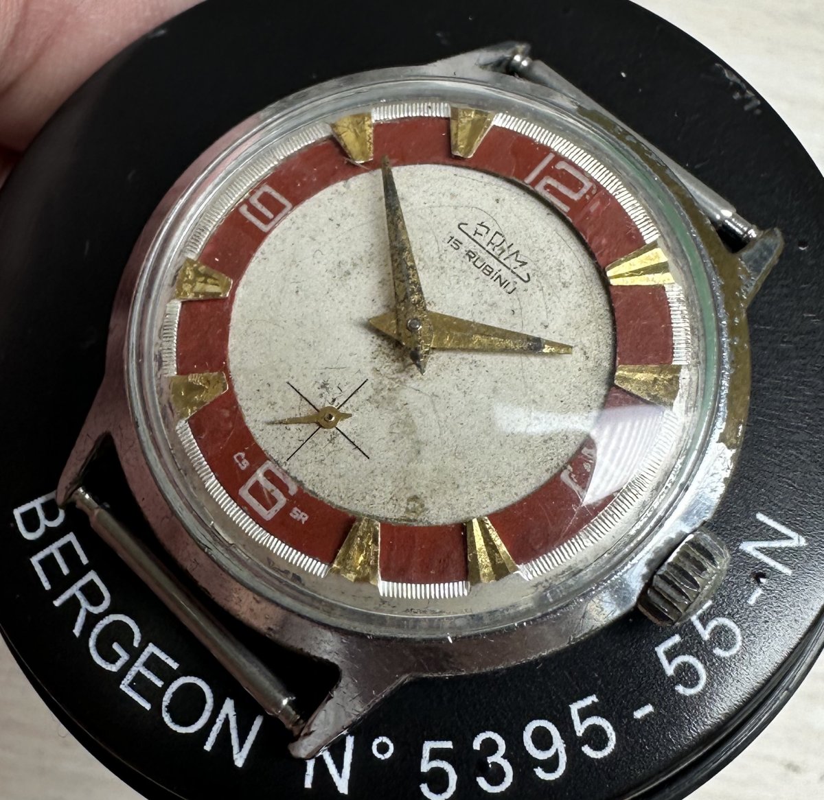 PRIM Sorela 50 082 1, priemer púzdra 34 mm, nálezný stav, predávam ako hodinky na renováciu, náhradné diely, funkčné, presnosť a dĺžka chodu nesledované, strojček Typ 0111, stav viď. fotografie.