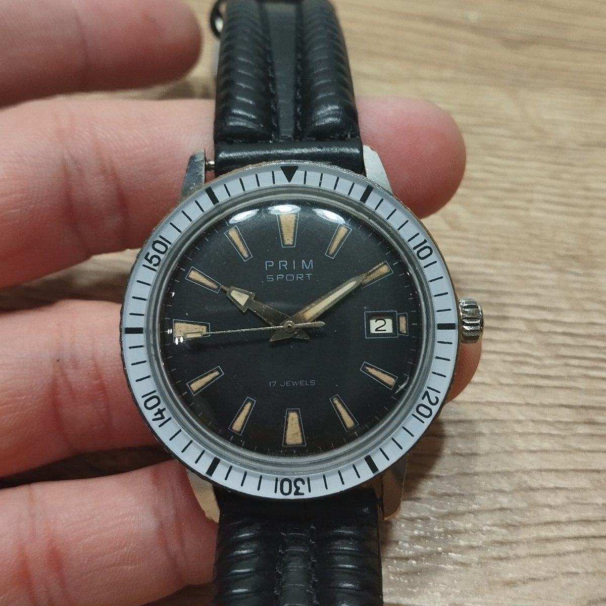 Hodinky Prim Sport 1, funkčné, vodotesnost nezistovana. Vzhľadom na vek predávam bez záruky. Na skličku prasklinka, možno pôjde preleštiť. Môžem poslať aj Zasilkovnou (Packeta) na vydajné miesto 130 kč do Cz