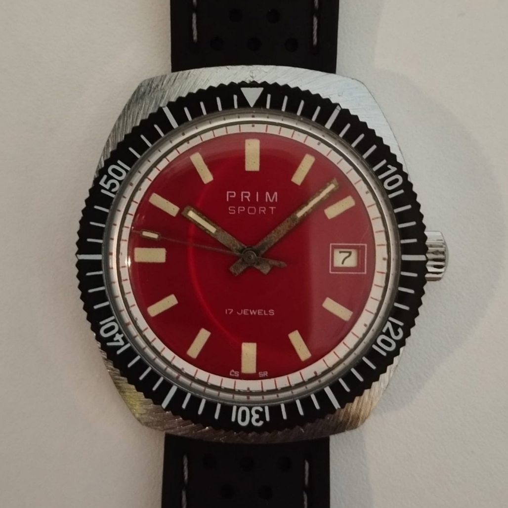 Hodinky Prim Sport 2 s červeným ciferníkom a brúseným puzdrom, funkčné, vodotesnost nezistovana. Môžem poslať aj Zasilkovnou (Packeta) na vydajné miesto 130 kč do Cz