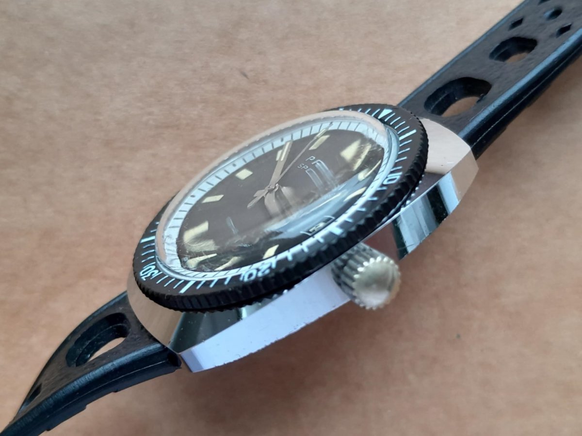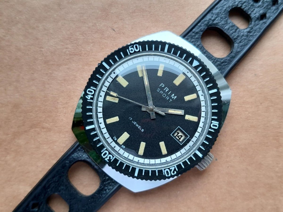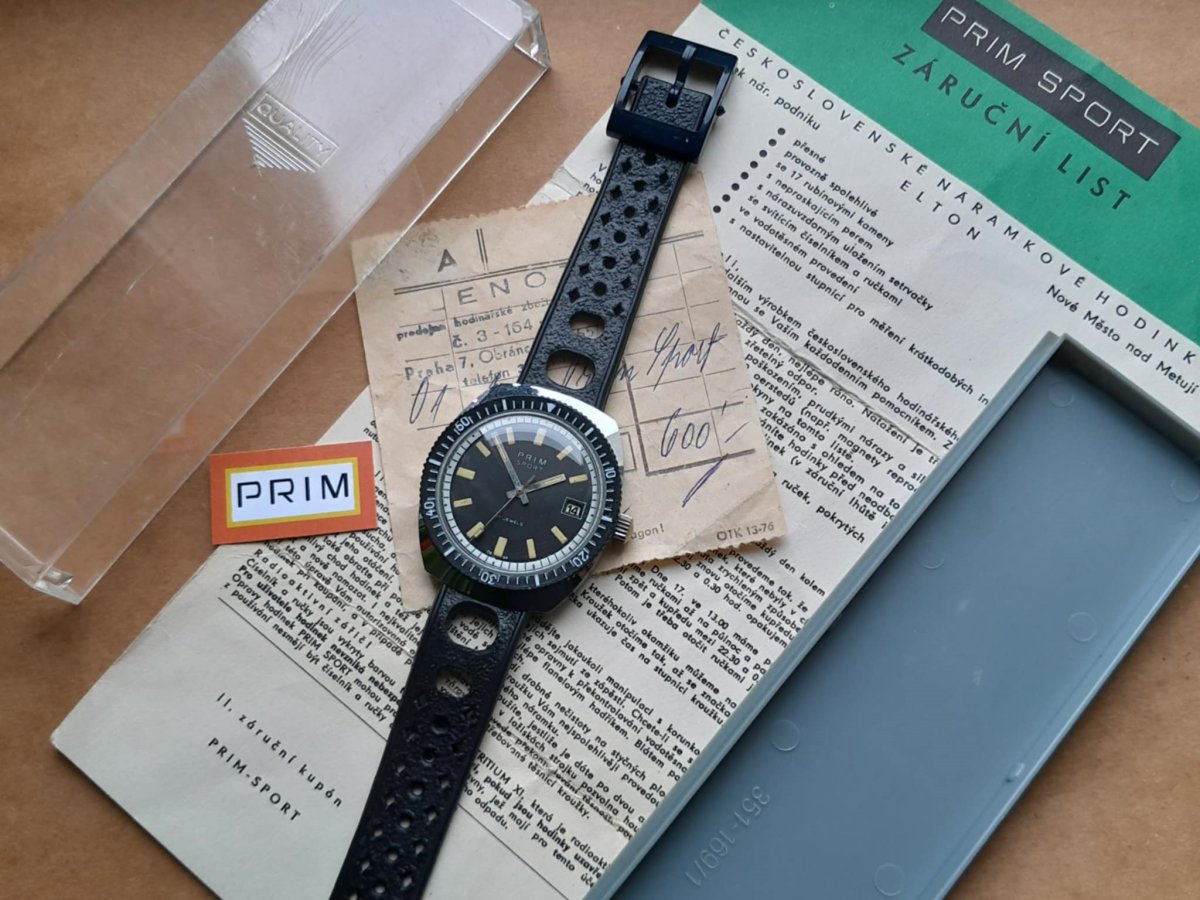 Ponúkam hodinky Prim Sport II v prevedení s čiernym ciferníkom so svietiacimi indexami a ručkami, ktoré boli predané v roku 1977 (vznik modelu 1972). Jedná sa o nádherný zbierkový komplet obsahujúci o.i. vzácny záručný list k týmto prvým modelom PSII s lumi, dochoval sa aj pôvodný paragón. Často krát sa totiž tento ZL nahrádza ZL z neskorších modelov PS2 - humberto, ktoré boli vyrábané od 80. rokov a tieto dodatky o lumi už neobsahujú. Na záručnom liste je uvedené, že hodinky majú svietiaci číselník a ručky. Hodinky sú vo veľmi peknom stave, zo spodnej strany nesie chróm mierne stopy po dlhoročnom skladovaní, ciferník je vo veľmi peknom stave s nezoxidovanou lumi, ručky rovnako nenesú takmer žiadne stopy reakcie niklu a lumi a teda nie sú skorodované, korunka je bombírovaná tak, ako to má pri tomto modely byť, sklo je pôvodné armovacie. Za zmienku stojí upoznorniť na pomerne vzácnu lunetu, ktorá má ešte lomenú 3 a dochovala sa takmer v nedotknutom stave. V hodinkách tiká strojček kal. 68.4 (v záveru produkcie tohto modelu došlo k začatiu výroby 68.4 a tak sa postupne 68.3 v modeloch nahrádzali). Hodinky neboli servisované, ale sú plne funkčné (v prípade záujmu o ich aktívne nosenie sa servis strojčeka do budúcna doporučuje). Na hodinkách je nasadený pôvodný vzácny športový remeň SAFARI v čiernej farbe, ktorý sa predával v predajniach Klenoty.