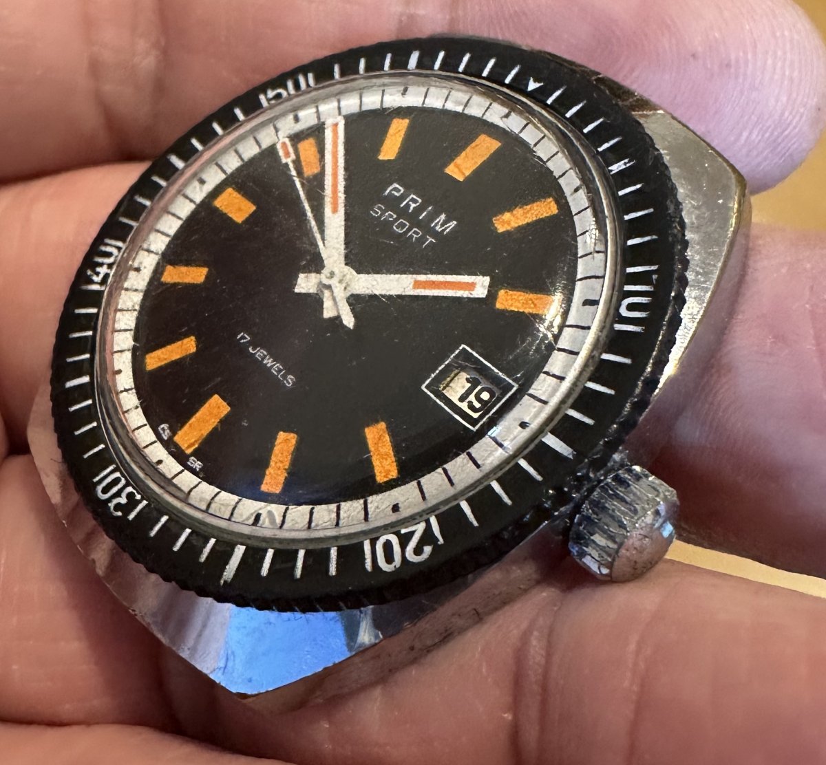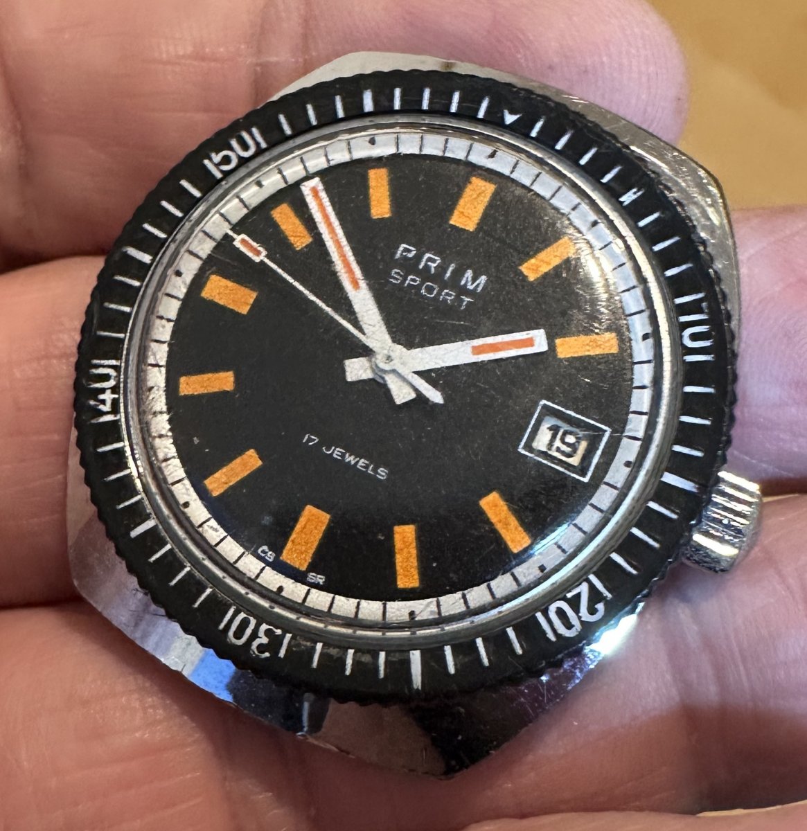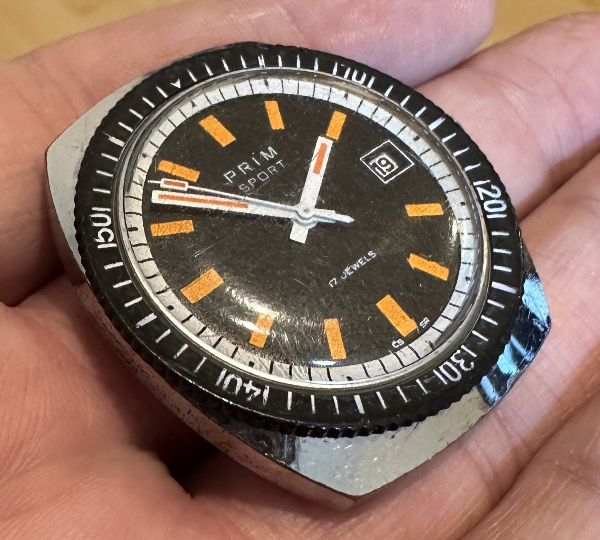 Prim Sport II - oranžové indexy - 68 386 1, rozmery púzdra 36 x 41 mm, funkčné, stav viď. fotografie.
