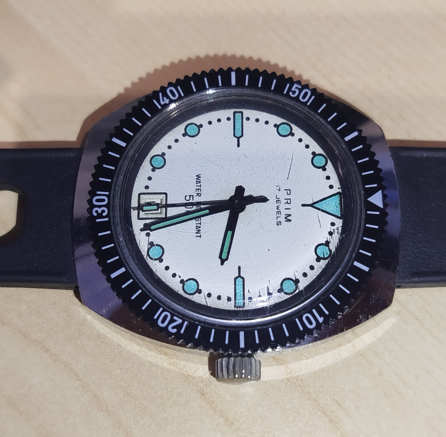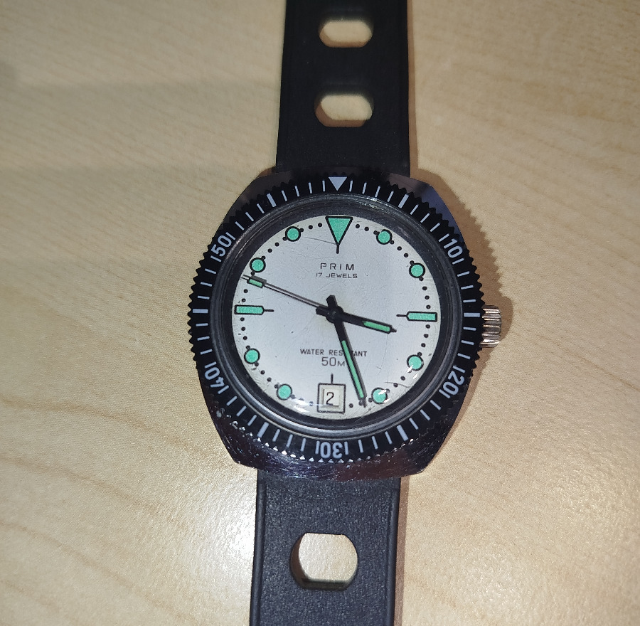 Zobrazené PRIM Sport II Potápky Biele , majú orginál zapúzdrenie / neprepotené / sklíčko preleštené tiež orginál luneta a remienok orginál zo starych zásob po hodinárovi , sú funkčné.