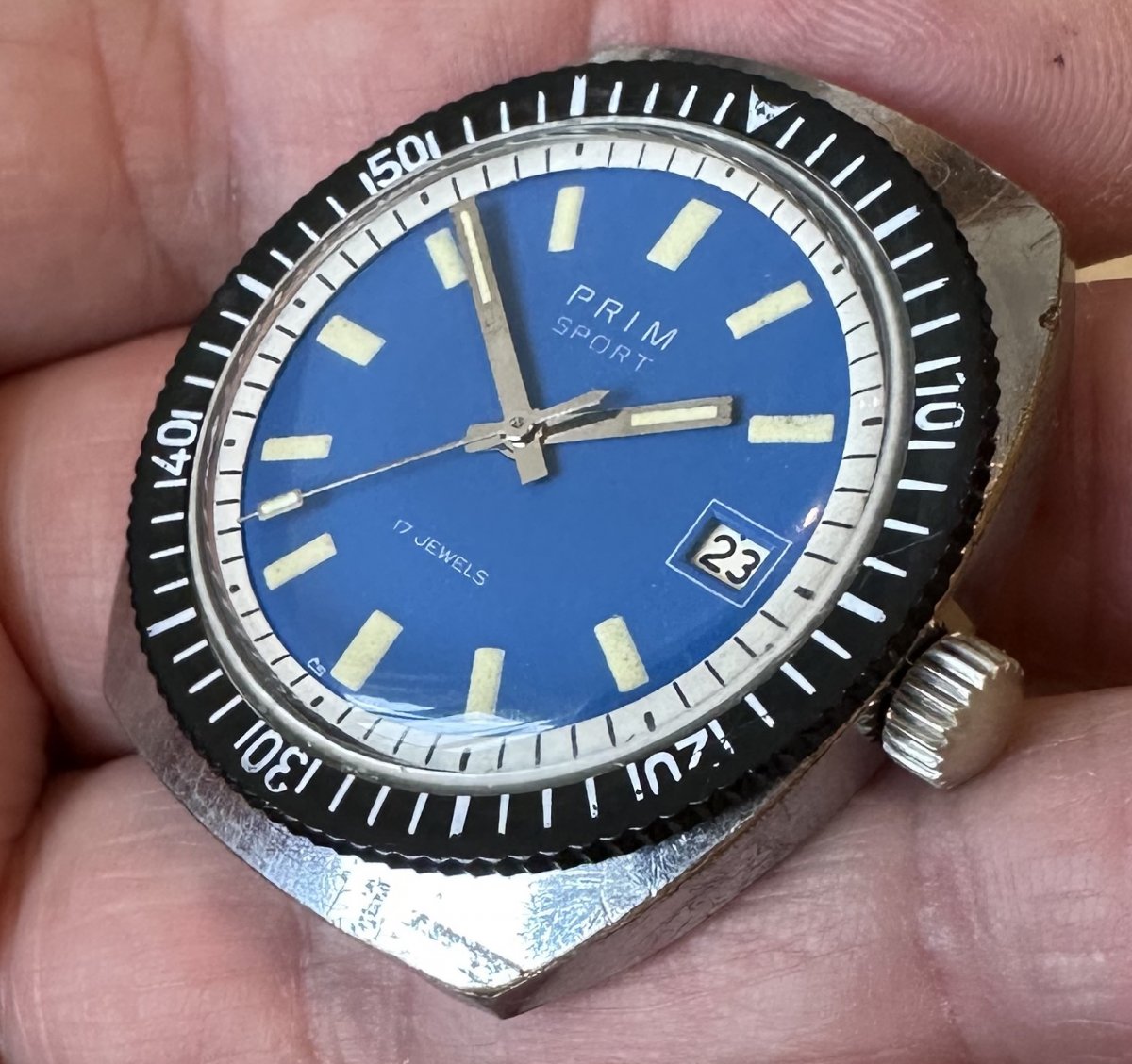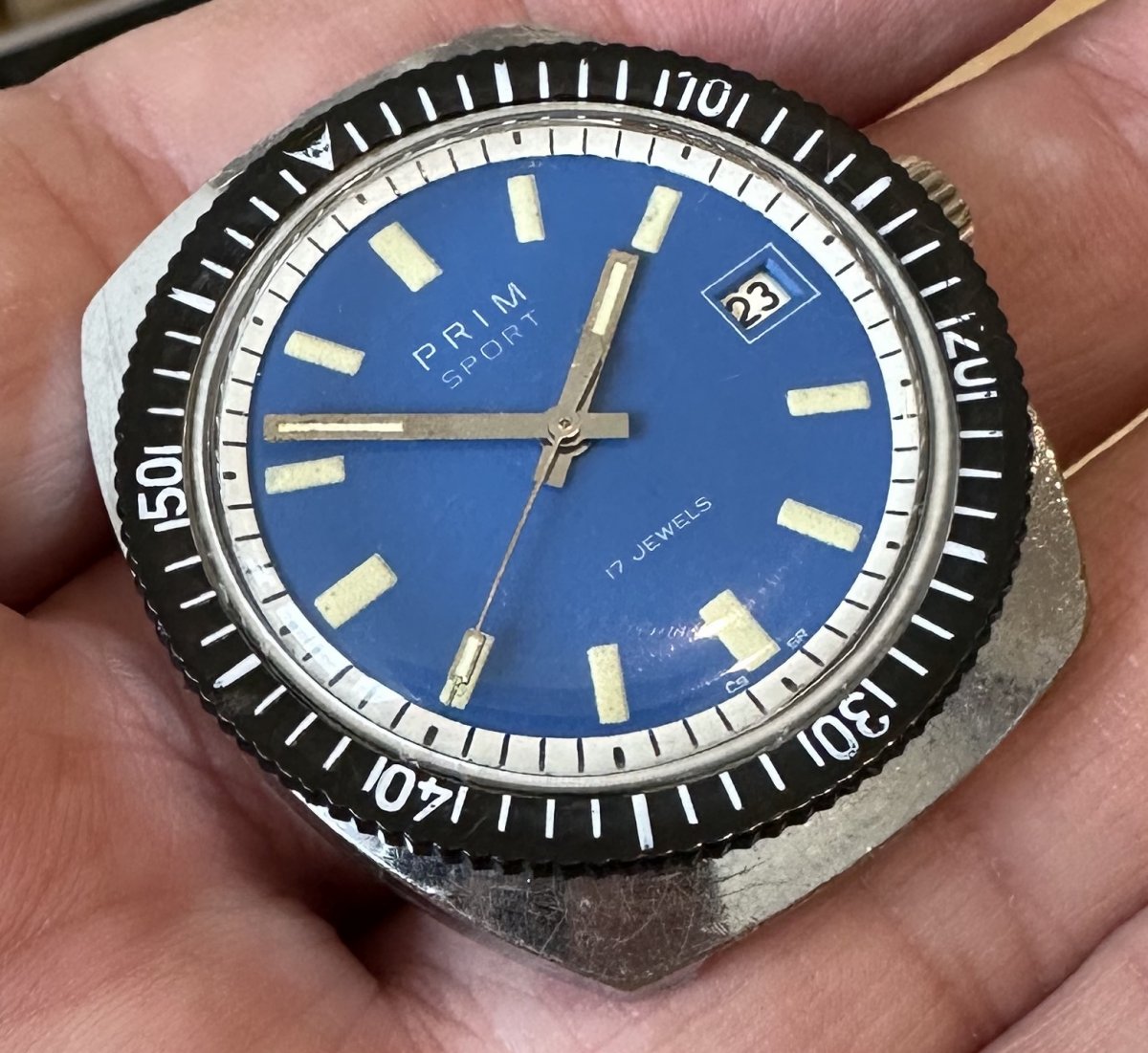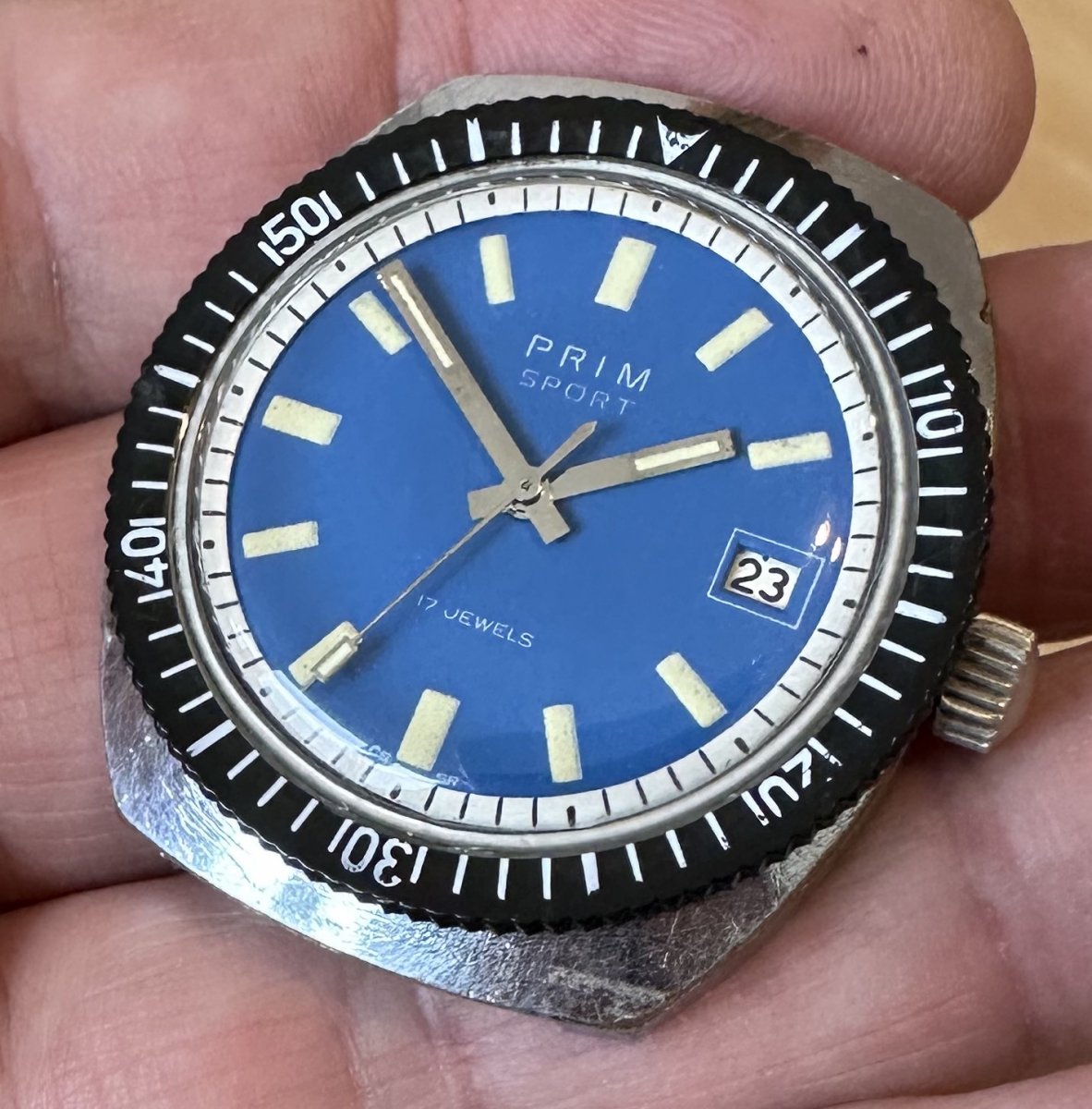 PRIM Sport II s modrým číselníkom, vo tme svietiace indexy a ručičky, typové označenie 68 208 1, funkčné, presnosť a dĺžka chodu nesledované, pôvodný originálny veľmi pekný zachovalý stav viď. fotografie.