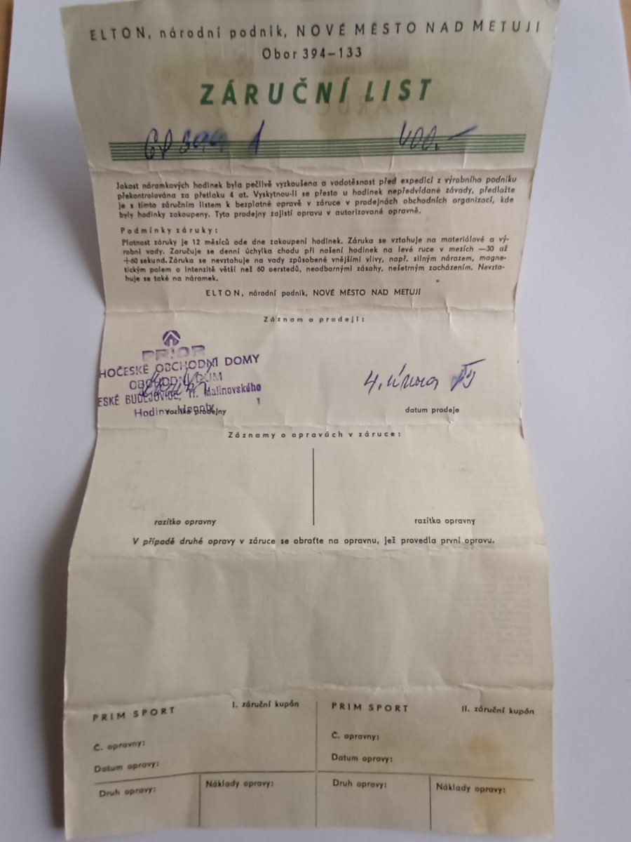Záruční list na hodinky Prim Sport