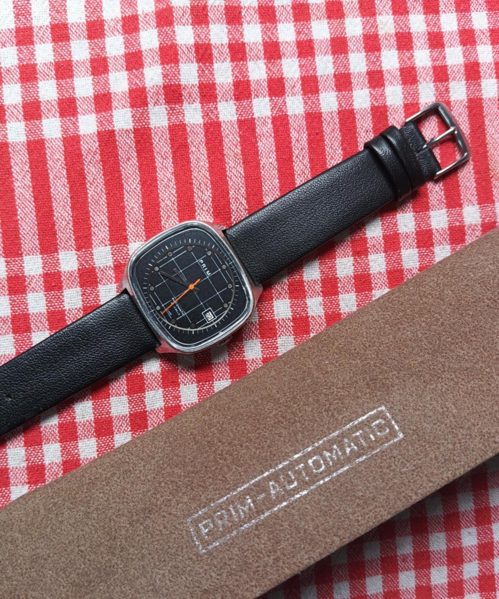 Součástí hodinek je původní penál s nápisem Prim Automatic ve vzácném sametovém provedení a nový řemínek od Prim Manufacture.