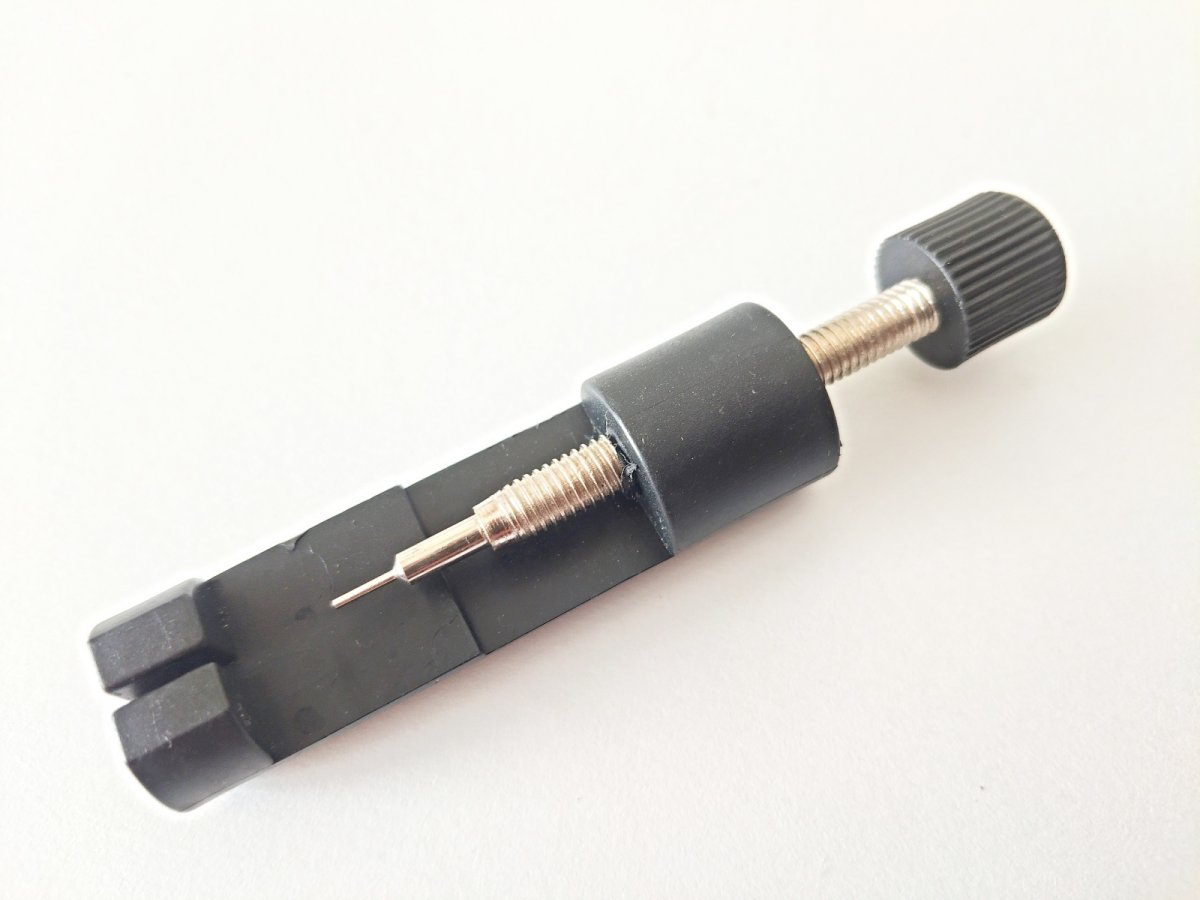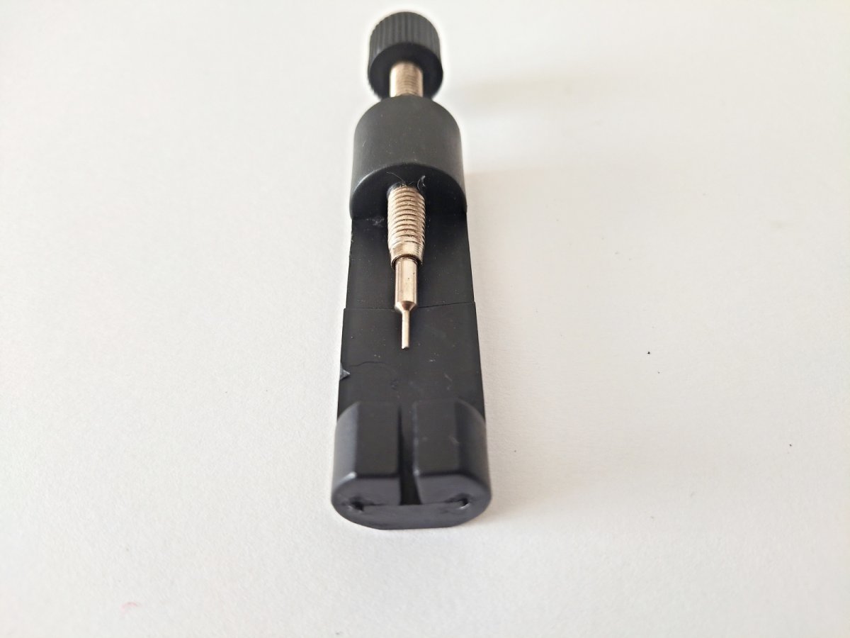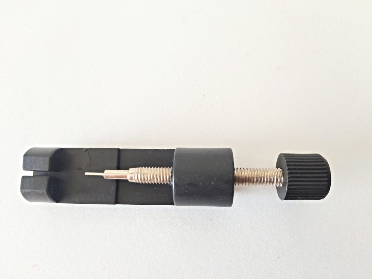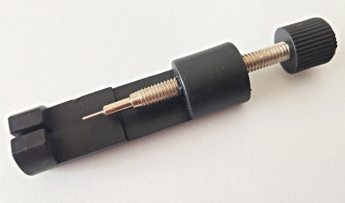 Cena je za 1x nový nepoužitý hodinářský přípravek na zkracování délky kovových tahů náramkových hodinek (tzv. odstraňovač pinů mezi jednotlivými články tahu). K dispozici více kusů, požadovaný počet lze vložit do košíku. Jedná se o doprodej zboží ze zrušeného hodinářského provozu, k dispozici je pouze omezené množství bez možnosti dalšího doskladnění.