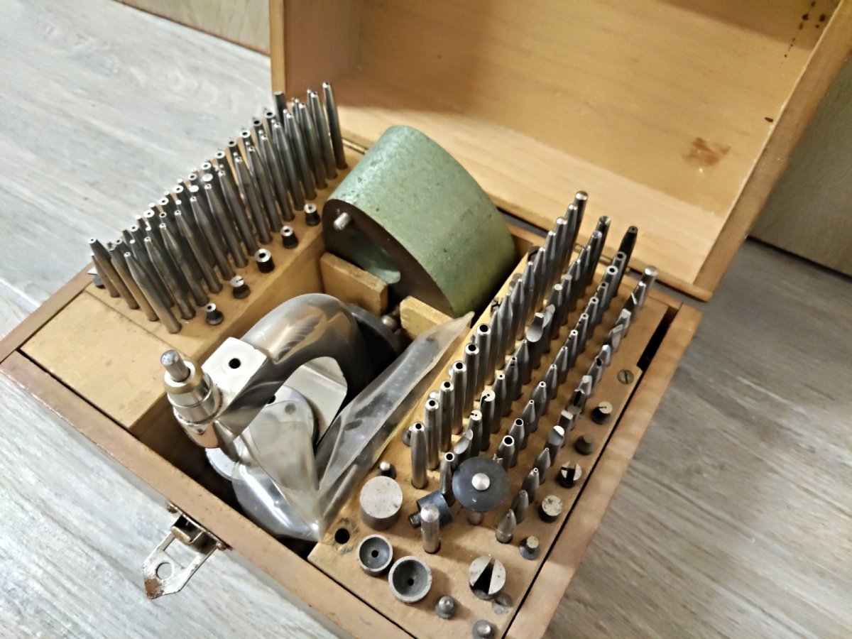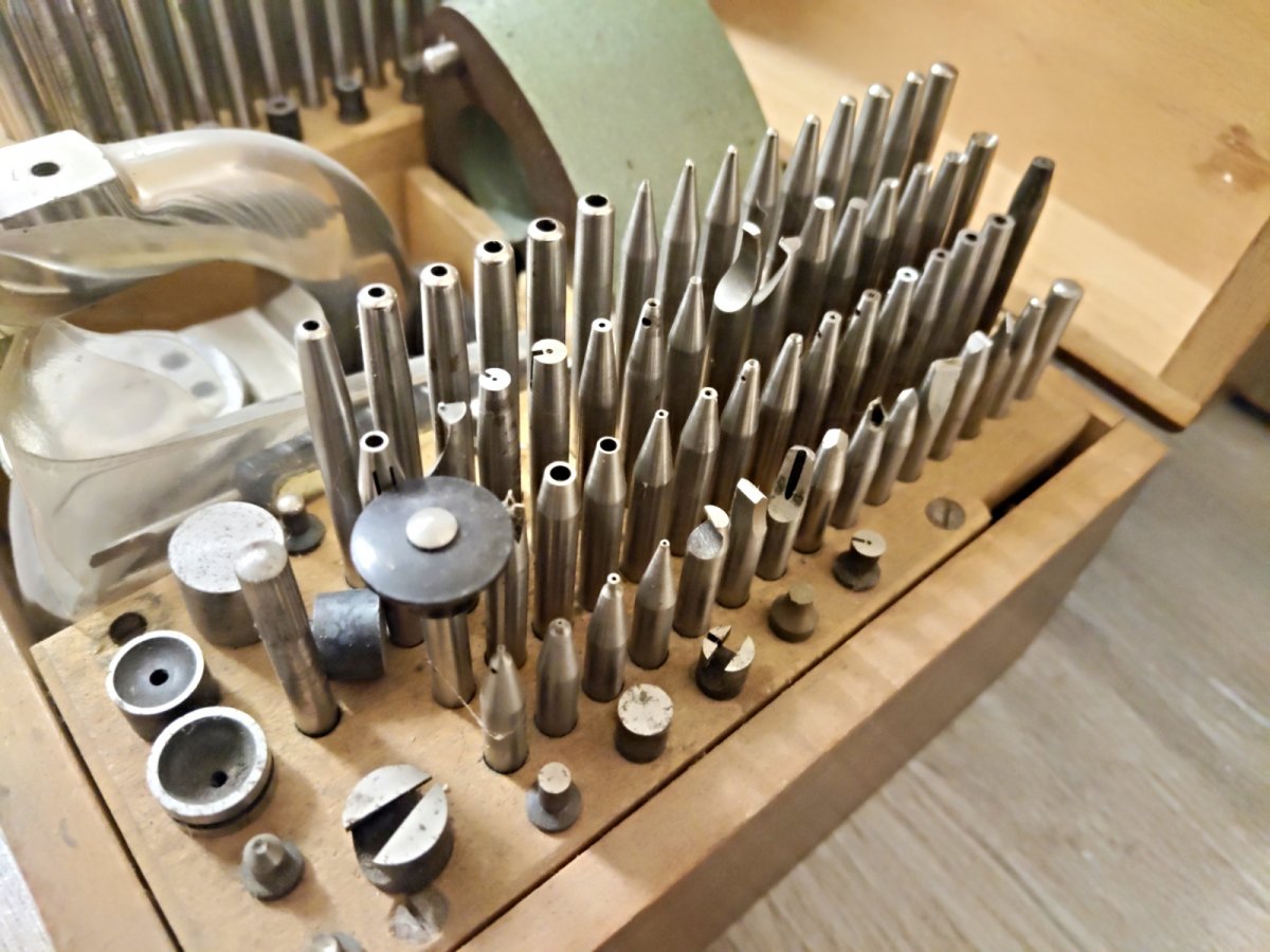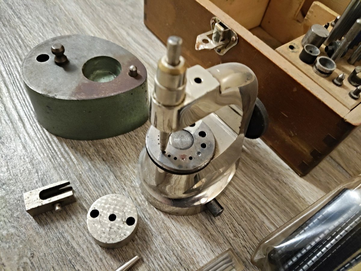 stav dle foto, hodinářská nýtovačka v dobovém dřevěném boxu, ze zrušeného hodinářského provozu.