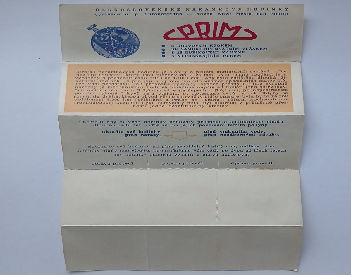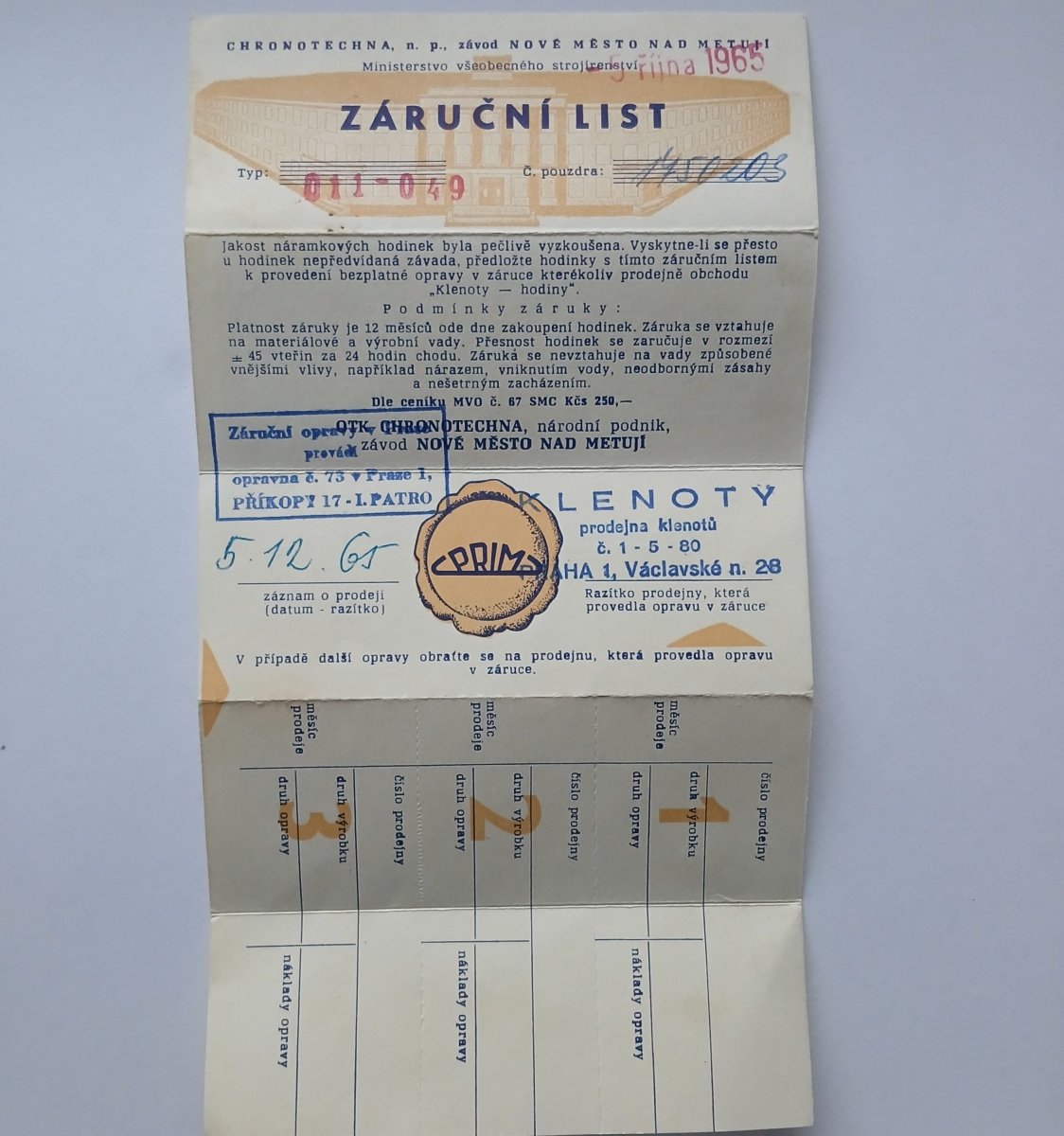 Záruční list na hodinky PRIM 011 049 z 5.12.1965