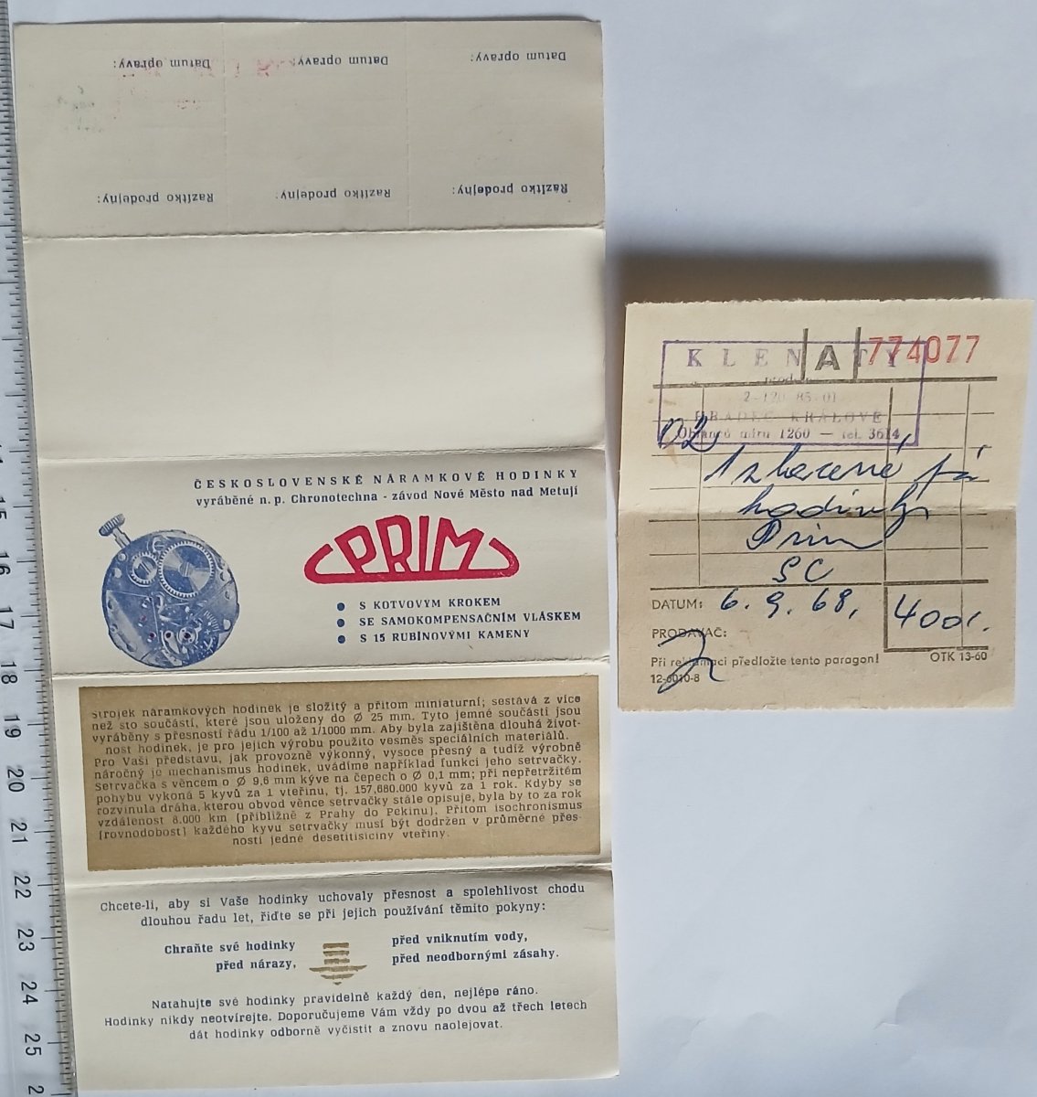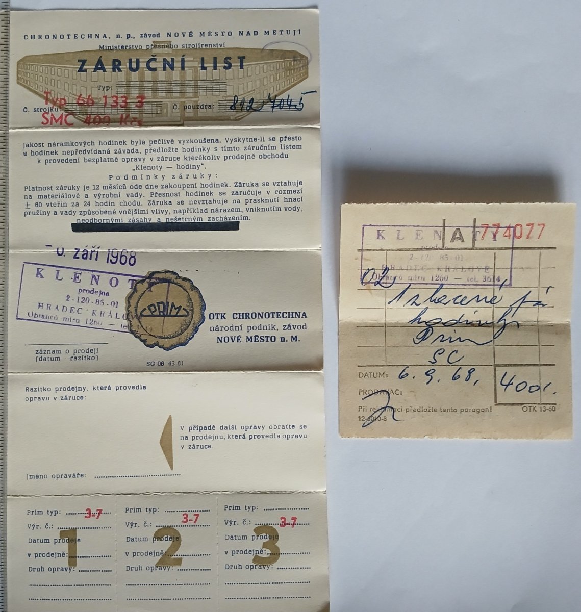 Záruční list k hodinkám PRIM k typu 66 133 3