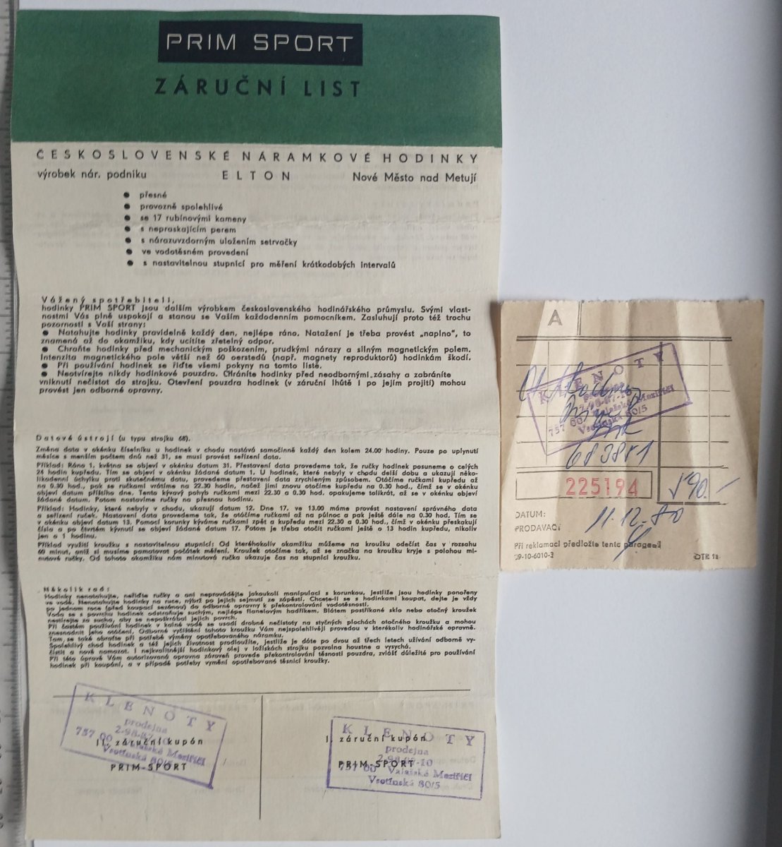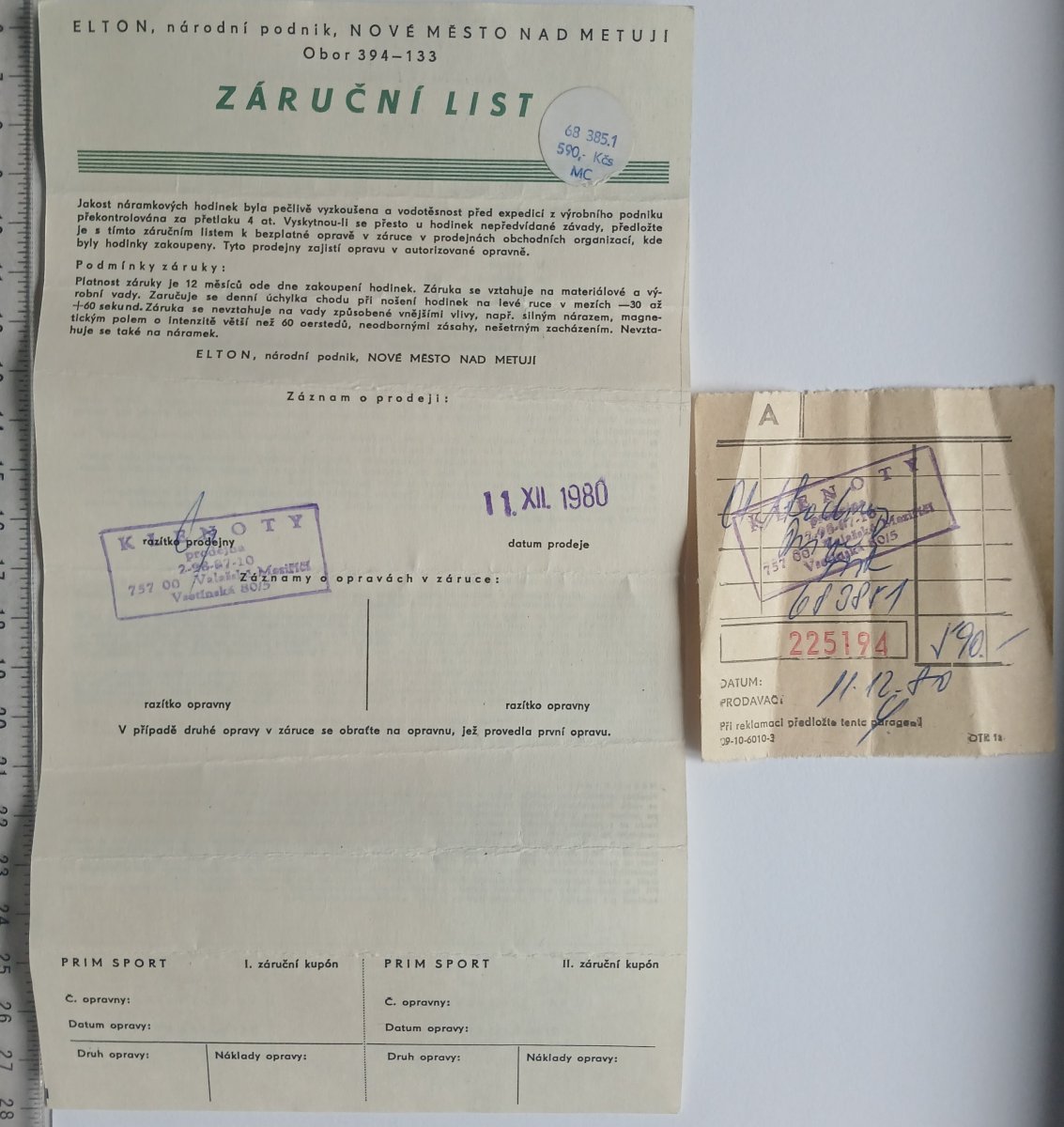 Záruční list k hodinkám SPORT 2 typu 68 385 1